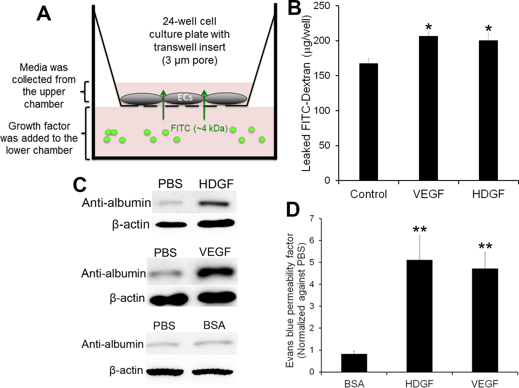 was added to the bottom chamber. B: Leaked FITC-dextran was quantified in the upper chamber at 6 h. C, D: Mice were intravitreally injected with HDGF (0.5 μg/eye), VEGF (0.2 µg/eye), or bovine serum albumin (BSA; 0.5 μg/eye) in