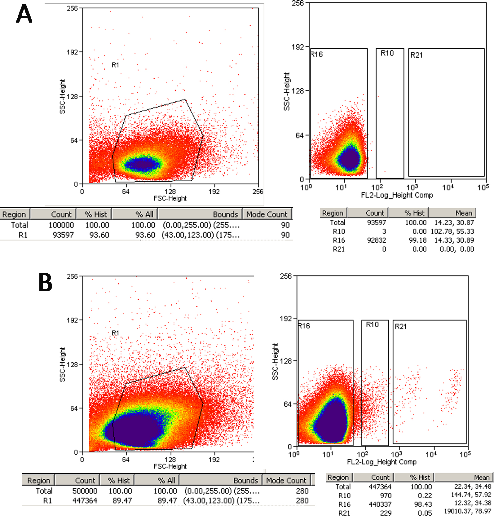 = side scatter (SSC), X axes = forward scatter (FSC), fluorescence intensity on the FL2 channel.