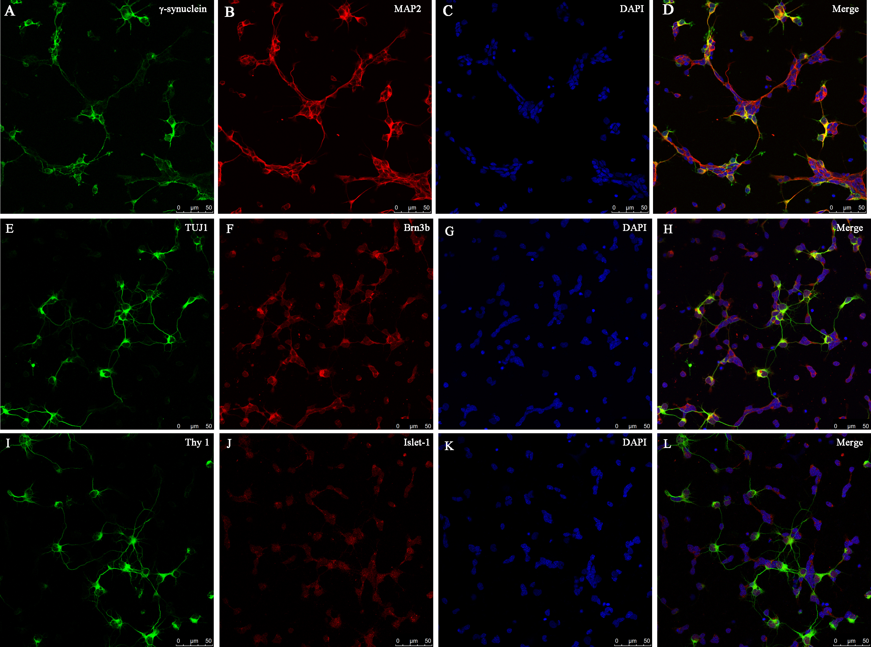 (green) and MAP2 (red; A–D), TUJ1 (green), and Brn3b (red; E–H), Thy-1 (green), and Islet 1 (red; I–L). 4’,6-diamidino-2-phenylindole (DAPI) nuclear staining is shown in C, G, and K, and the merged images are shown in D, H and L. Scale bar = 50 μm.