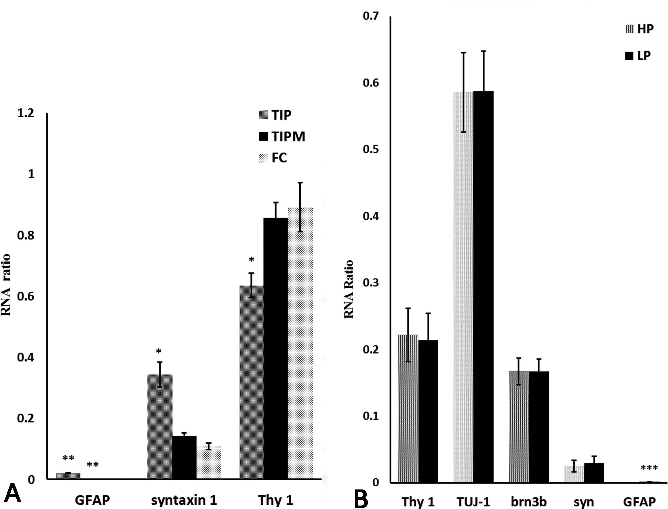 Figure 9. Quantitative expression of cell markers in isolated RGCs. A: Quantitative real-time PCR for glial fibrillary acidic protein (GFAP), syntaxin 1, and Thy-1 of retinal ganglion cells (RGCs)