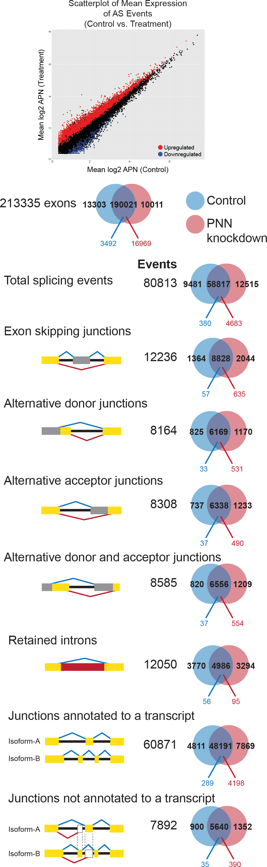 and control cells (the overlapping area in the Venn diagrams), plotting the mean expression (as log2 APN) of the control cells versus the PNN-knockdown cells. Differentially expressed events are red (upregulated) and blue