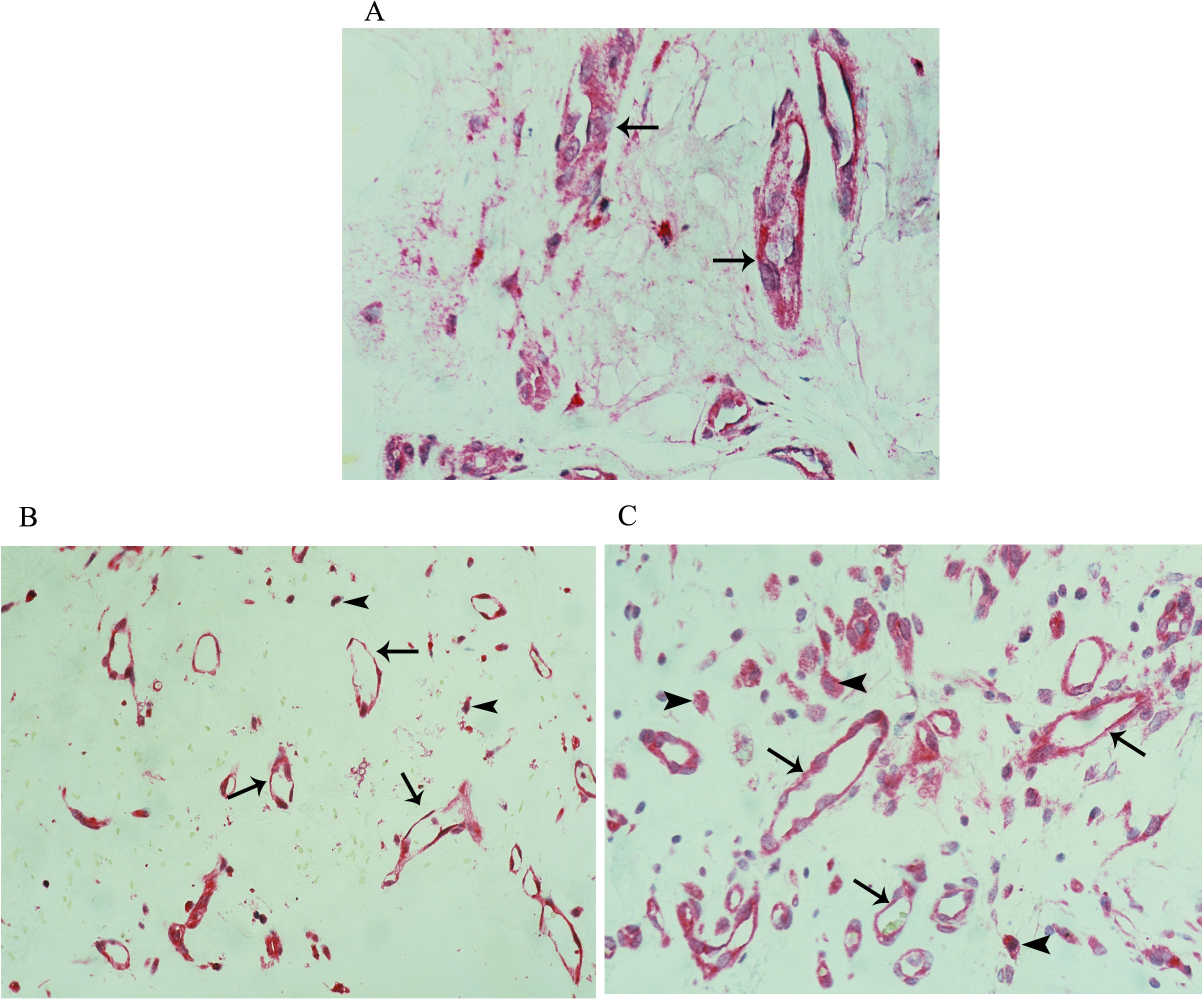 (arrows) and stromal cells (arrowheads). B: Low power (original magnification 25X). C: High power (original magnification 40X).