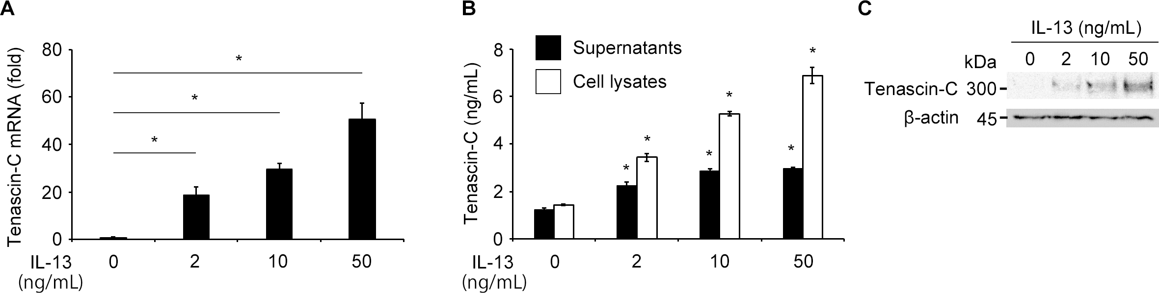 B: ELISA analysis of tenascin-C in cell lysates and supernatants in VSMCs stimulated with the indicated concentrations of IL-13.