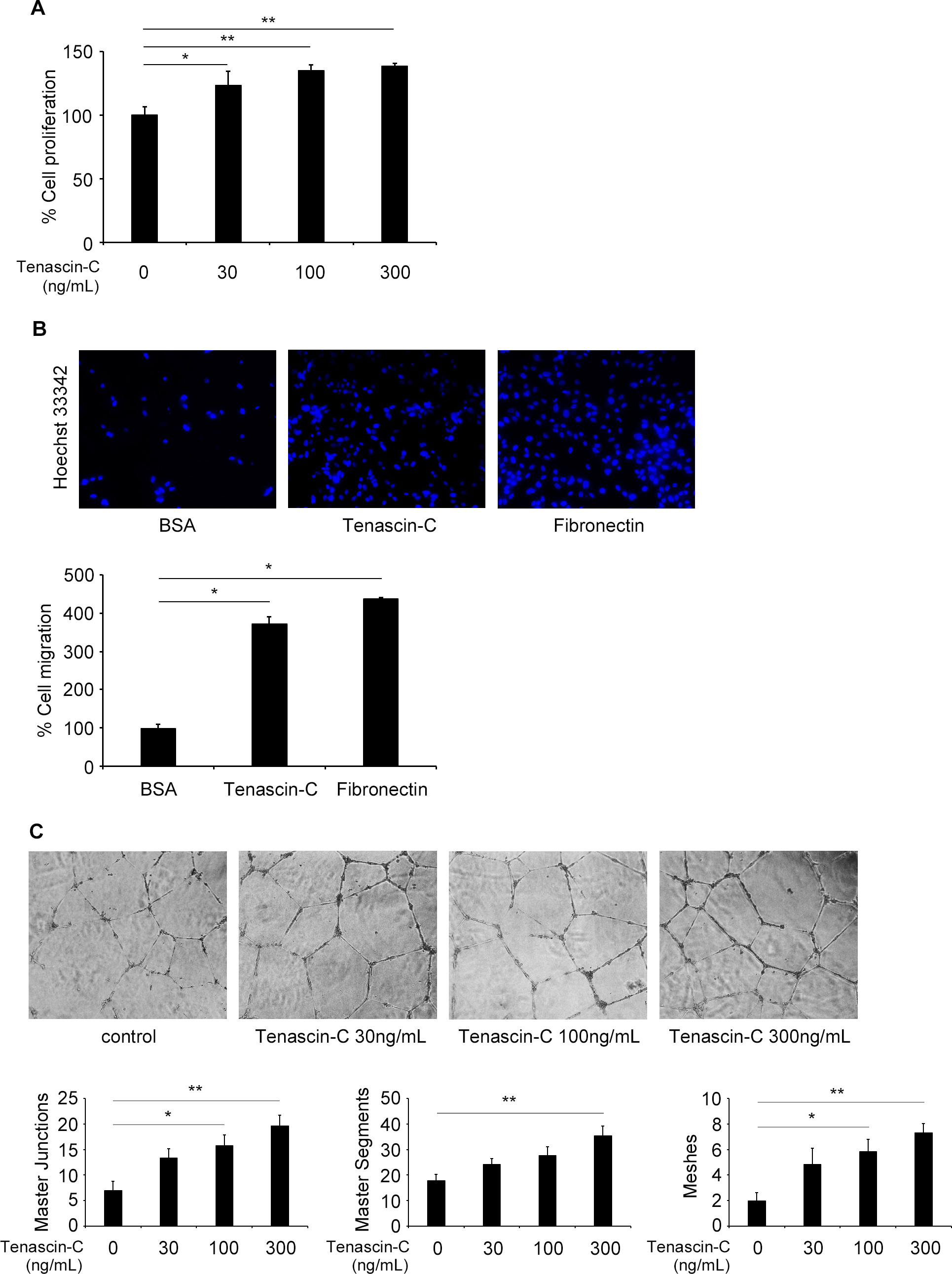master segments, or meshes in the presence of varying concentrations of tenascin-C (30, 100, and 300 ng/ml). *p <0.05, **p
