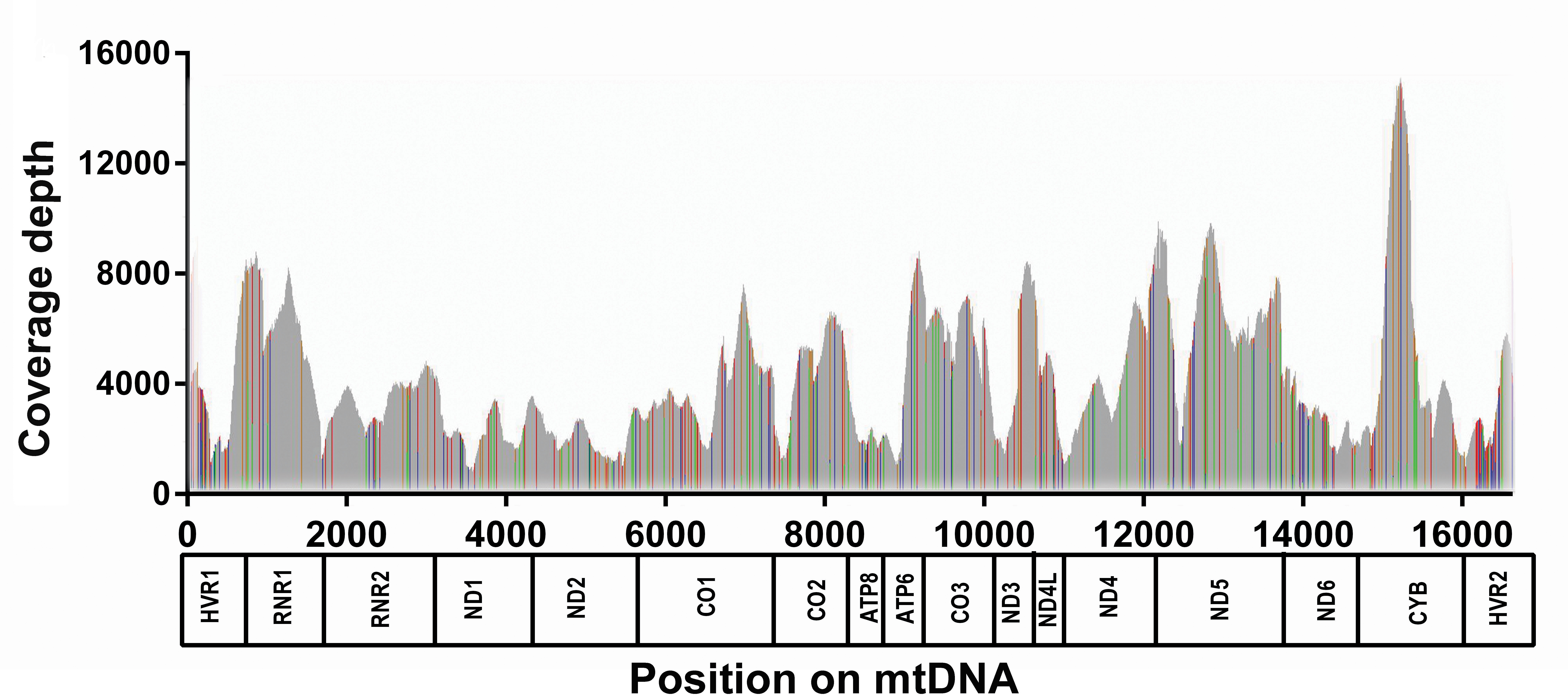 Figure 1. Complete coverage of mtDNA was obtained by Pool-seq. A representative IGV coverage map from one of the 43 DNA pools is shown,