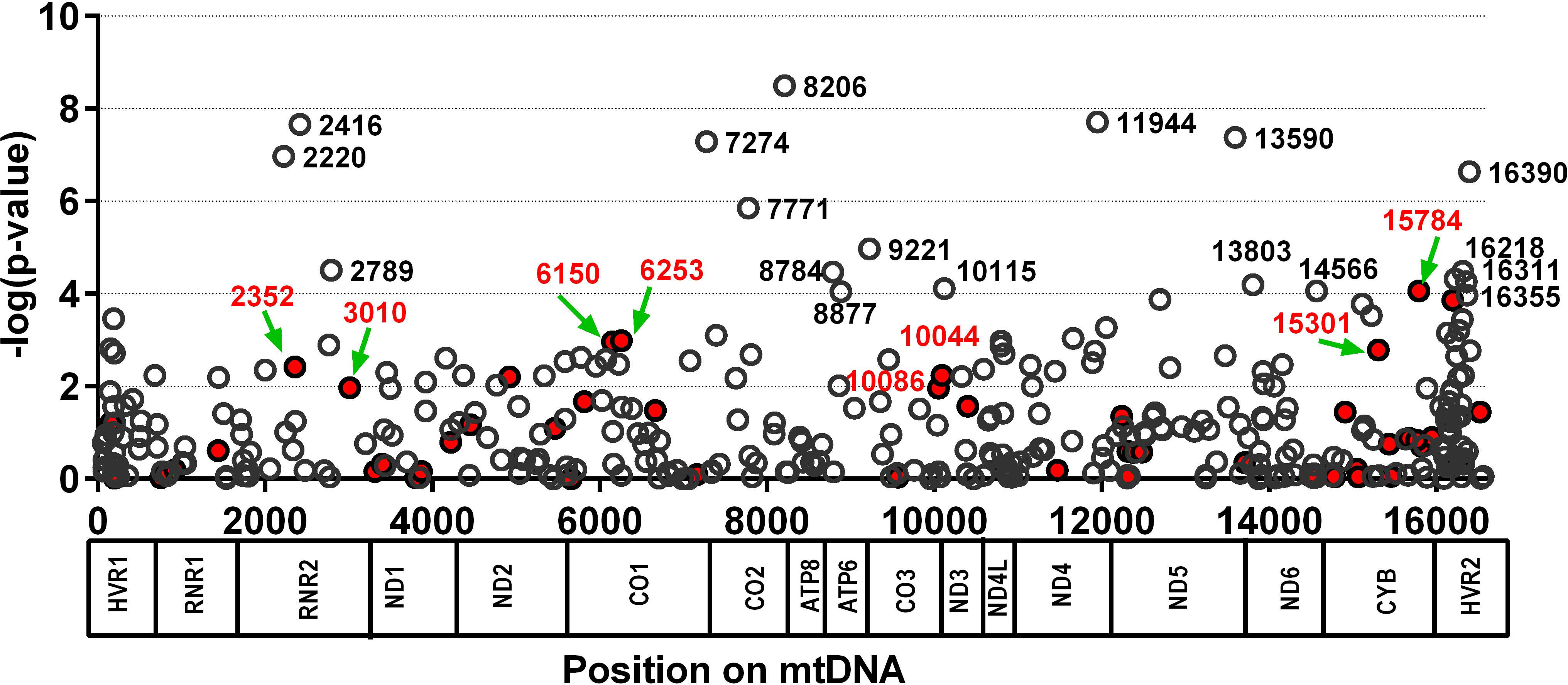 Chi-square test, and the negative log10 of the resulting p value is plotted. Variable positions annotated as having a disease association in MITOMAP or as “pathogenic”