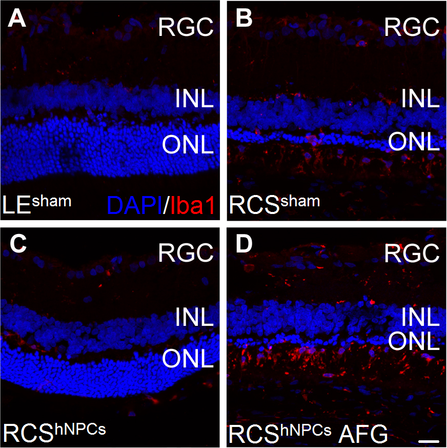 Figure 8. The presence of macrophages and microglia decreases after hNPC treatment. A: Wild-type Long Evans (LEsham) have few macrophages and microglia, as detected with the Iba1 antibody. B: Retinal degenerate Royal College of Surgeons (RCSsham) have Iba1+ cells throughout the retina. C: Similar to LEsham, Royal College of Surgeons rats with a subretinal injection of human forebrain derived neural progenitor cells (RCShNPCs) have few Iba1+ cells. D: However, areas further from the injection site away from the graft (AFG) with less photoreceptor survival contain numerous