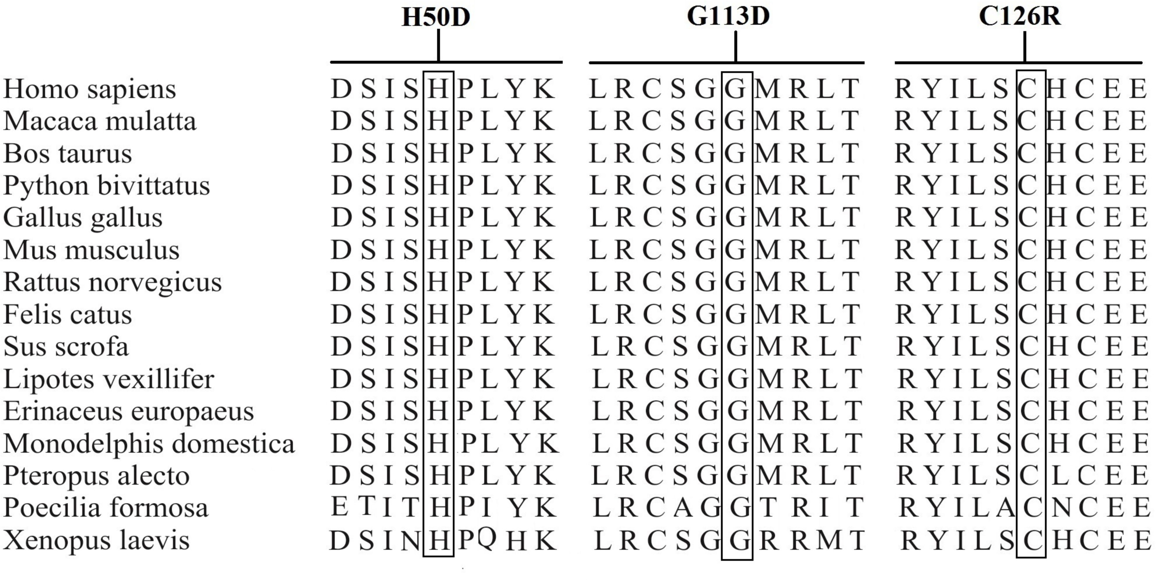 p.G113D, and p.C126R) demonstrates the evolutionarily conserved nature of the wild-type residues. The amino acid sequences