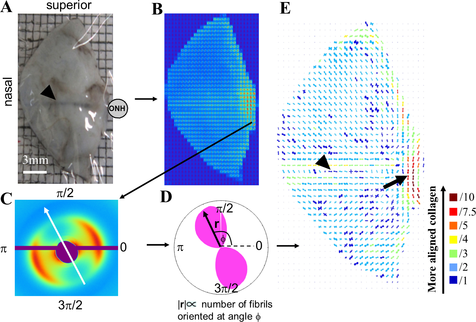 peak indicates that collagen is preferentially oriented in the direction of the white arrow. D: Polar vector plot of collagen orientation distribution extracted from the pattern in C. E: Montage of polar vector plots showing collagen orientation across the whole specimen. Arrowhead: An abrupt change from horizontal to near-vertical collagen demarcates the position of the vessel visible in A. Arrow: circumferentially oriented collagen, ringing the optic nerve head (ONH), characterizes the peripapillary sclera. The plots