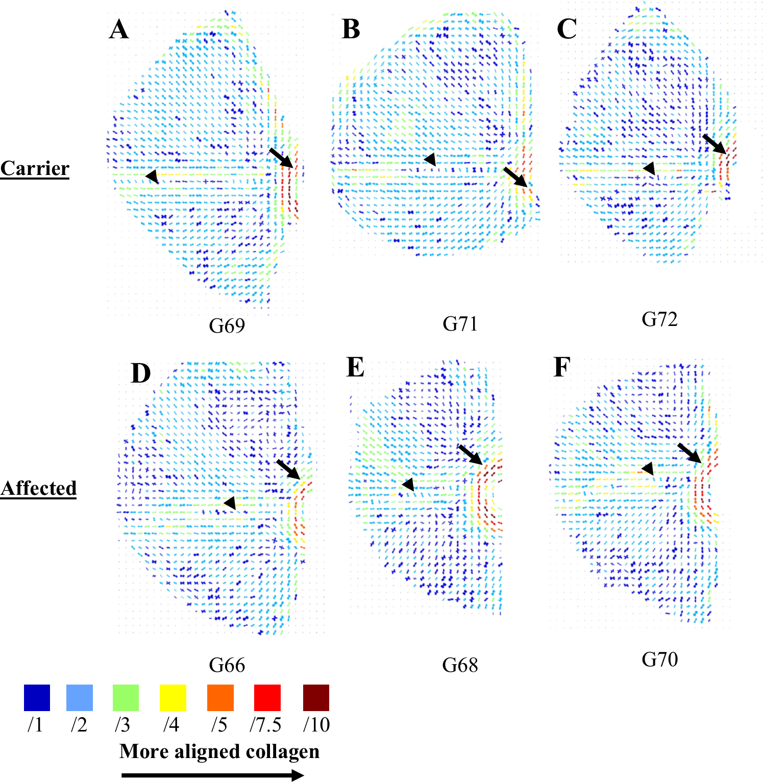 Figure 4. Collagen orientation maps. Polar vector maps of collagen fibril orientation across the (A–C) carrier and (D–F) affected ADAMTS10 mutant posterior canine scleras. Arrowheads and arrows mark the characteristic features associated with the nasal blood vessel