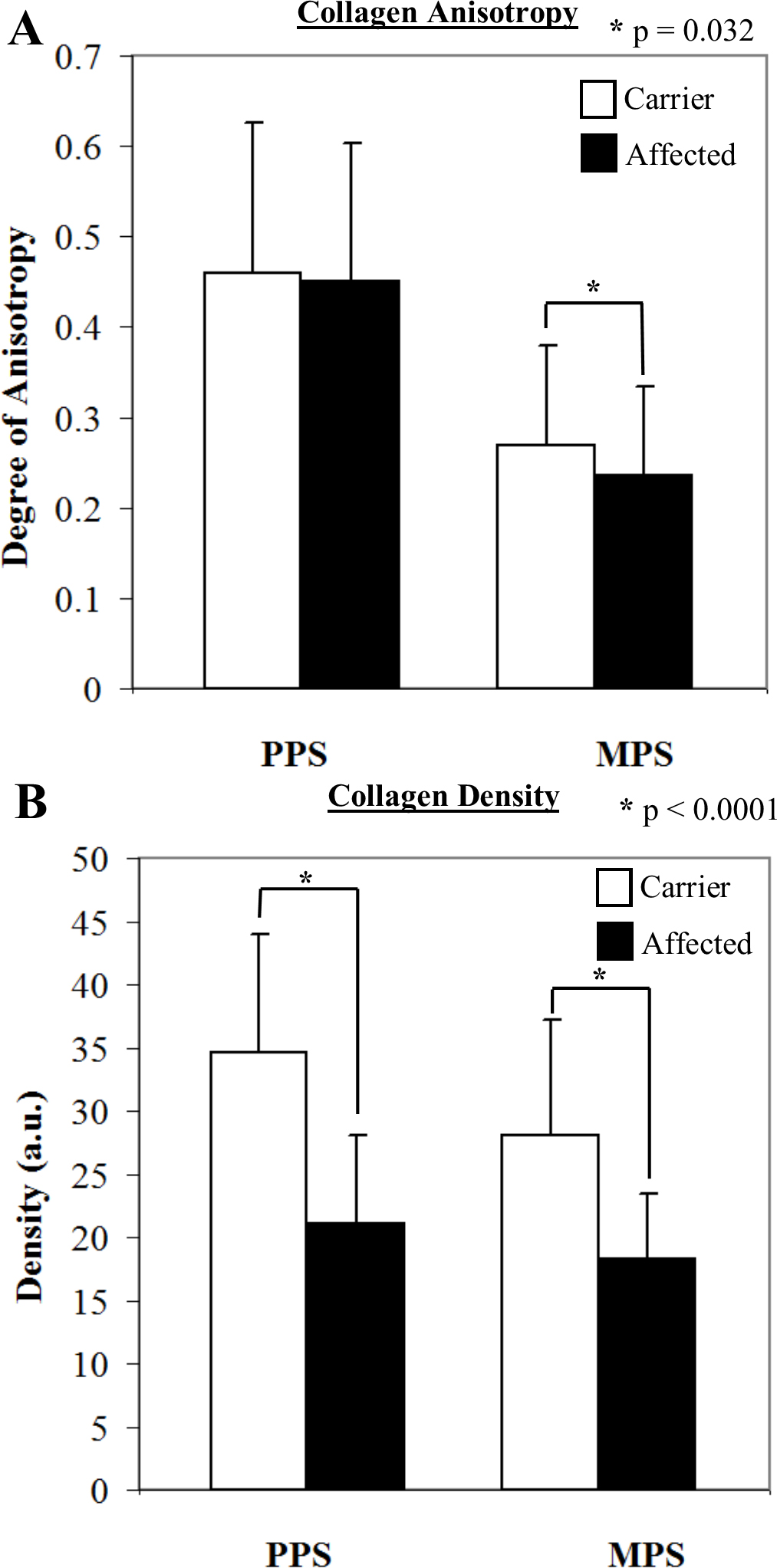of the collagen structure within peripapillary (PPS) and mid-posterior (MPS) scleral regions between the carrier and affected