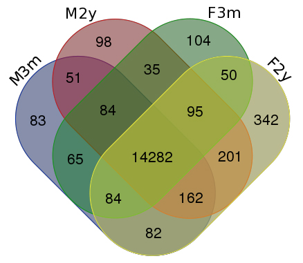 Figure 3. Venn diagram of selective gene expression in 3-month- and 2-year-old male and female mouse eyelids. A total of 14,282 genes