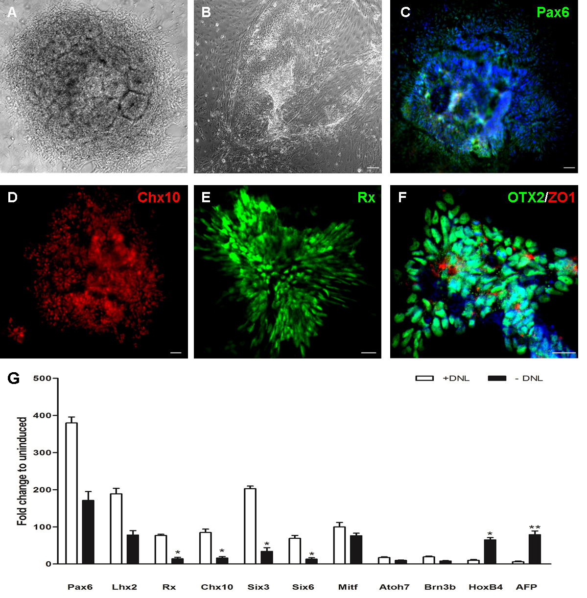 = 100 μm. G: Quantitative real-time PCR analysis showed Pax6 and Lhx2 were further upregulated in both groups after attachment for another 10 days, whereas eye field-specific regional genes Rax, Chx10, Six3, and Six6 are upregulated substantially in the DNL group when compared with the control group (* p<0.05); correspondingly, HOXB4 (the hindbrain and spinal cord) and AFP (an endoderm marker) are largely suppressed in the DNL group (* p<0.05, ** p<0.01). + = the DNL group, - = the control group.