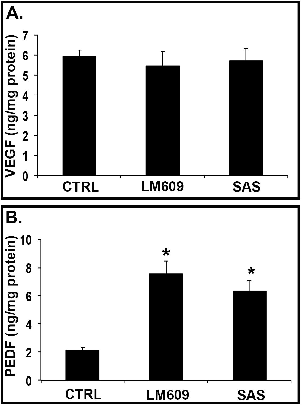Figure 3. SAS and LM609 significantly increase PEDF protein levels in the RPE-EC co-culture system. Protein levels of VEGF (A) and PEDF (B) in RPE (lysed cells) co-cultured with ECs were measured by ELISA. *p<0.05 increased relative to RPE co-cultures with ECs