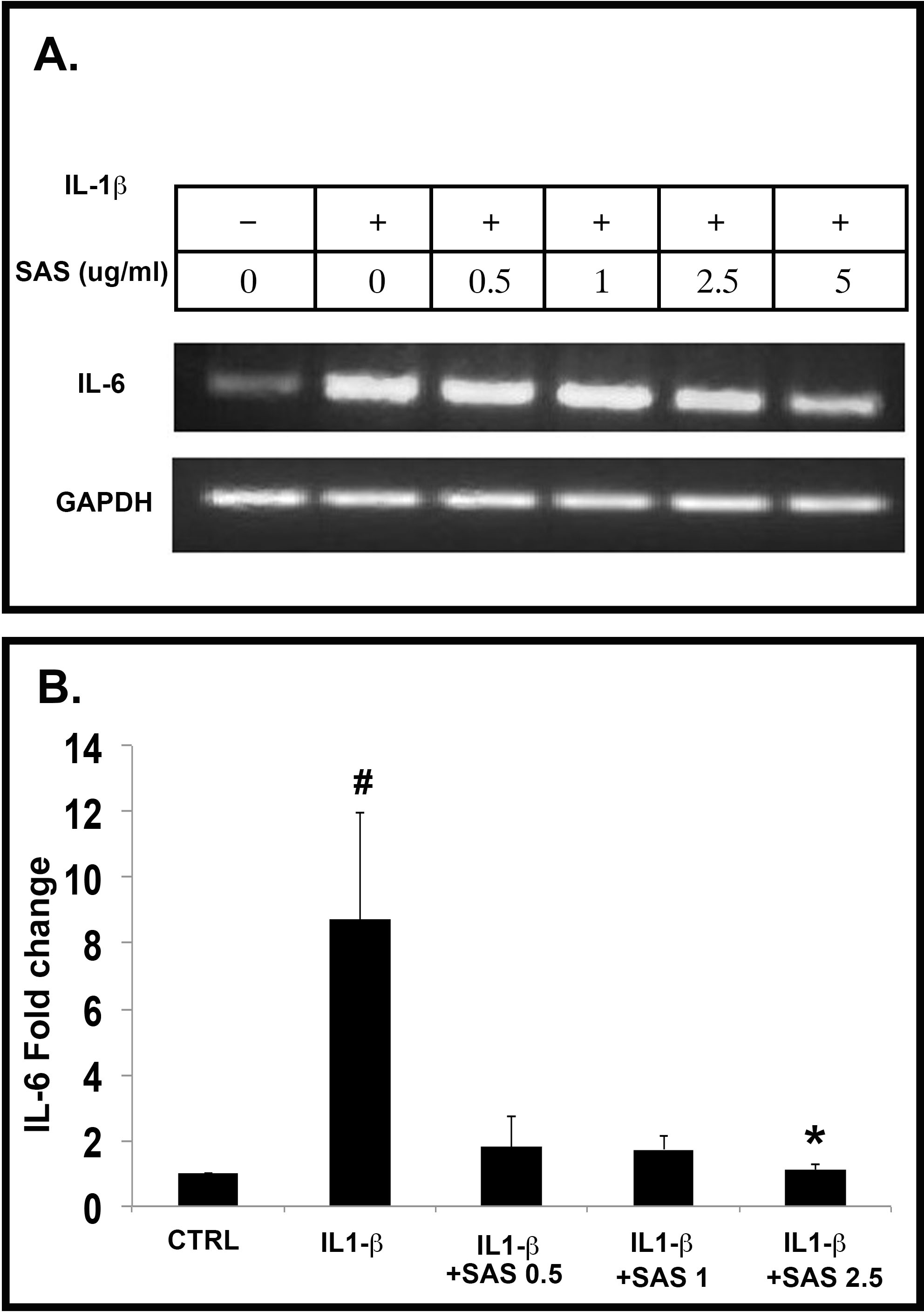 Figure 6. SAS decreases IL-1β-induced mRNA expression of IL-6 in ARPE-19 and HRPE cells. A: ARPE-19 cells were starved in serum-free medium overnight and then incubated for 1 h with 0.5, 1, 2.5, or 5 µg/ml of SAS