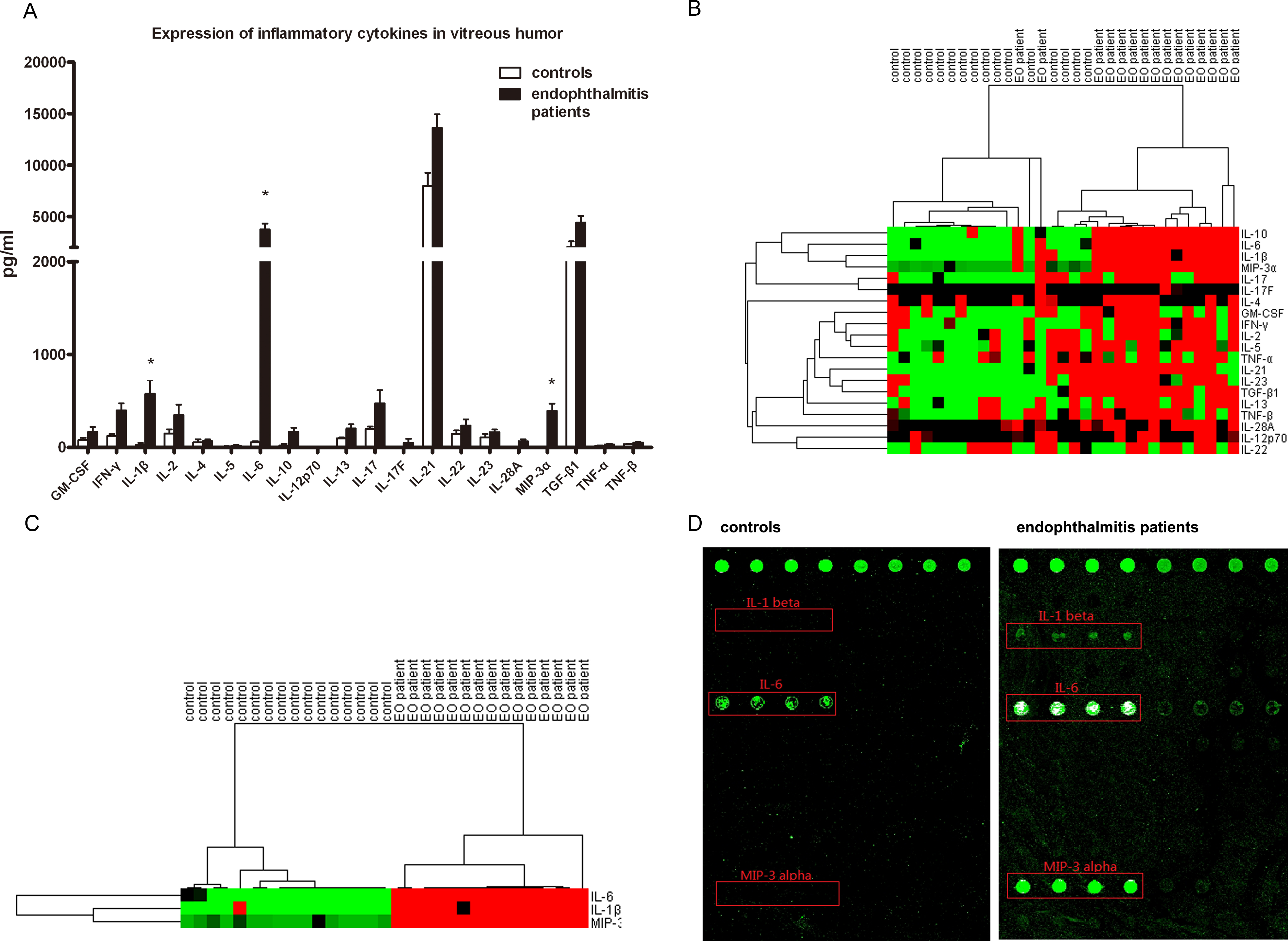 Figure 3. The cytokine profile in the VH from patients with endophthalmitis (n=15) and controls (n=16). A: The expression of 20 cytokines was detected using antibody cytokine array. The interleukin (IL)-1β, IL-6, and macrophage