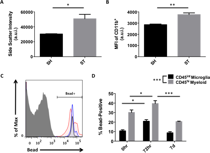 and infiltrating CD45hiCD11b+ myeloid cells (red). Positive gating was determined using fluorescence minus one (FMO) control (shaded gray). D: The percentages of bead-positive CD45intCD11b+ microglia versus CD45hiCD11b+ myeloid cells were quantified at three time points. Error bars show mean ± standard error of mean (SEM). Abbreviations: MFI