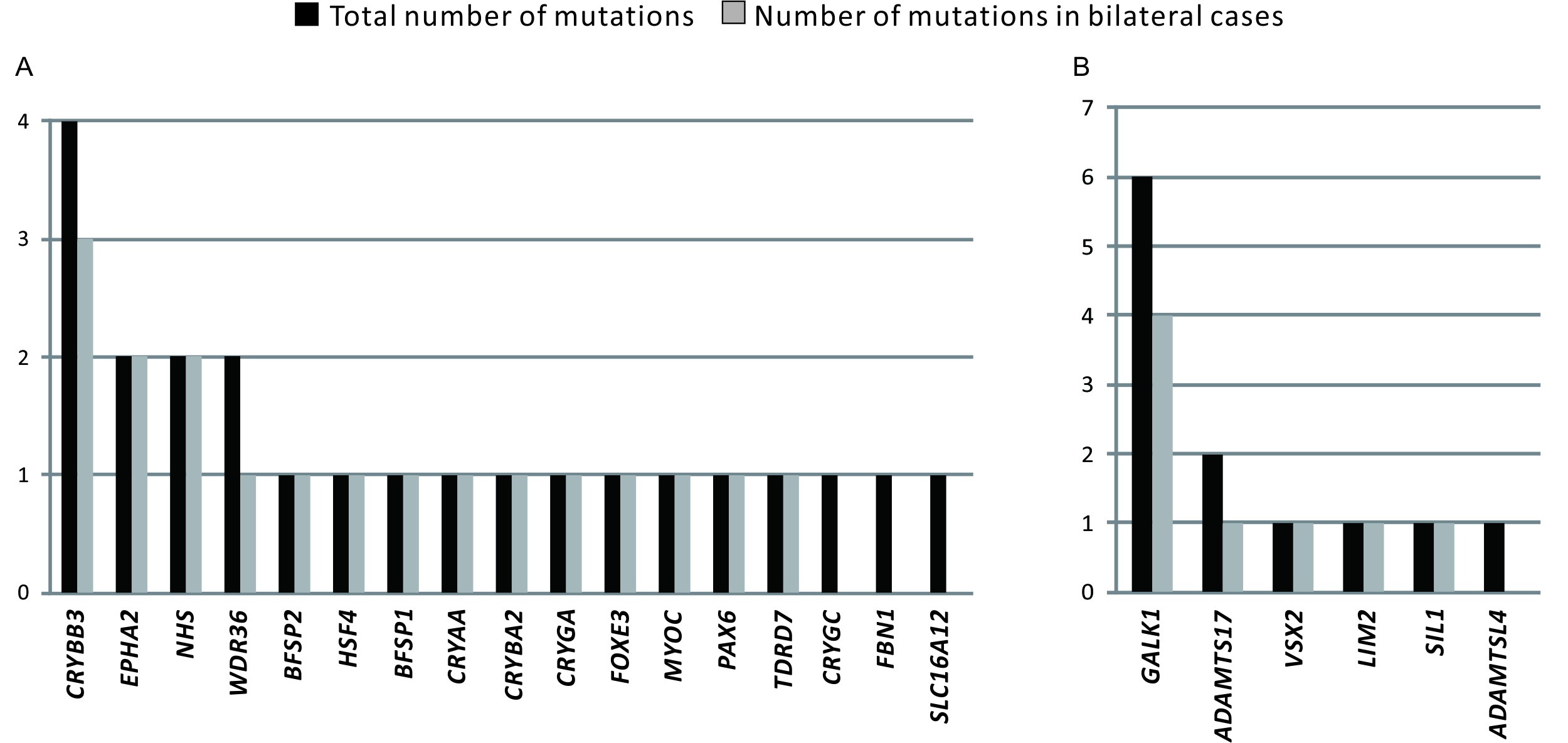 Figure 1. The mutation frequencies of the selected genes. A: The mutations in genes responsible for autosomal dominant or X-linked lens disease. B: The mutations in genes responsible for autosomal recessive lens disease. Black bar, total number of mutations; gray bar,