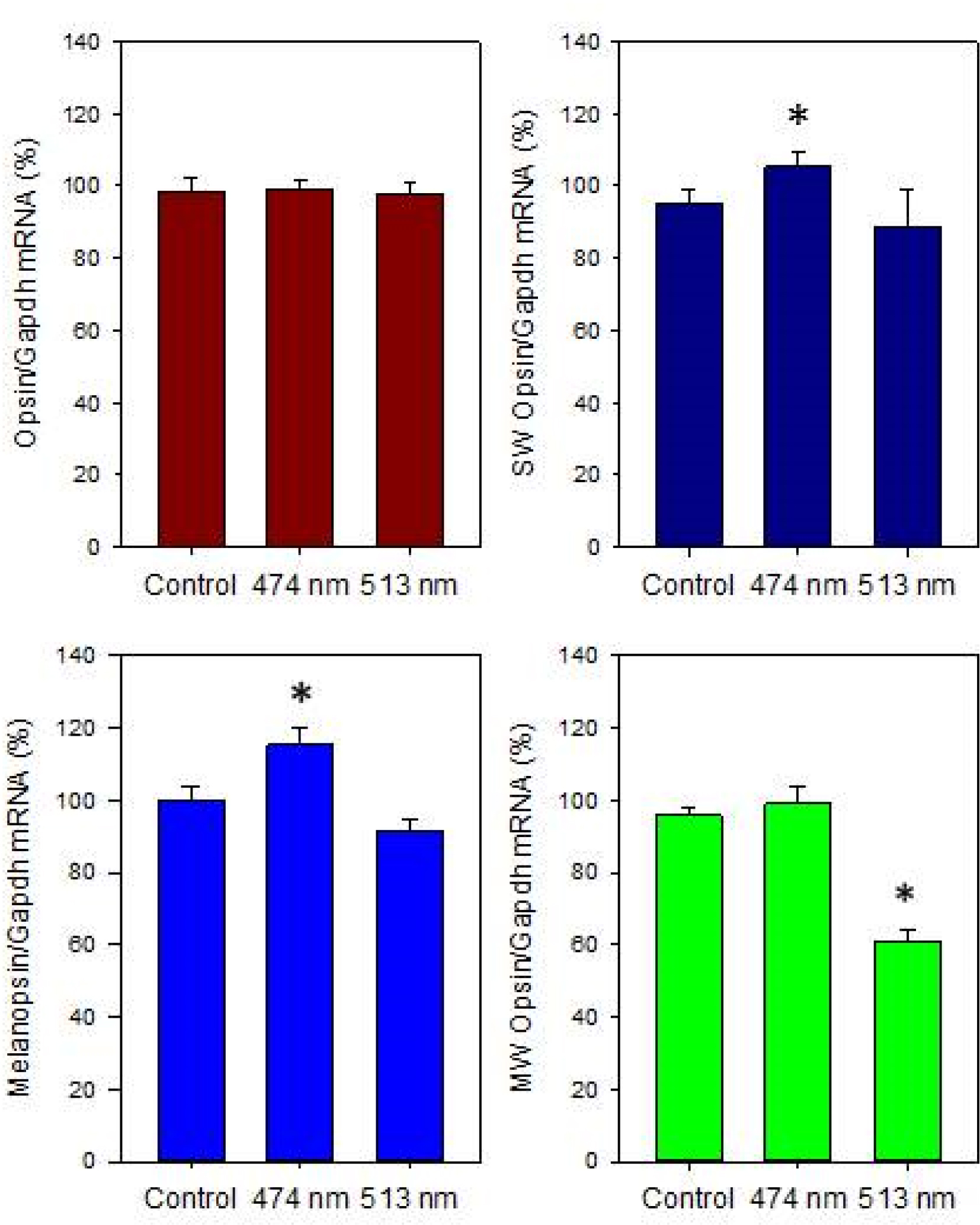 and medium wavelength sensitive opsin (* one-way ANOVA followed by Holm-Sidak tests, p<0.05). Rats were exposed to blue, green,
