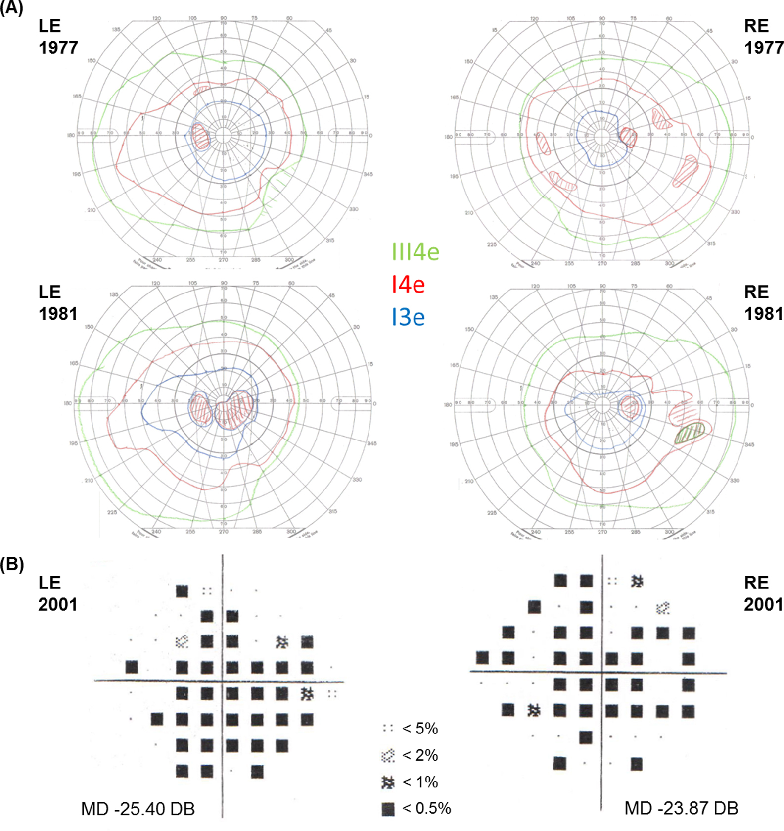 indicated with colored isopters. Light stimulus size III is larger than I, and intensity level 4 is greater than 3. B: Humphrey 24–2 visual fields at age 59 years demonstrate extensive loss of the central field in both eyes. Mean deviation