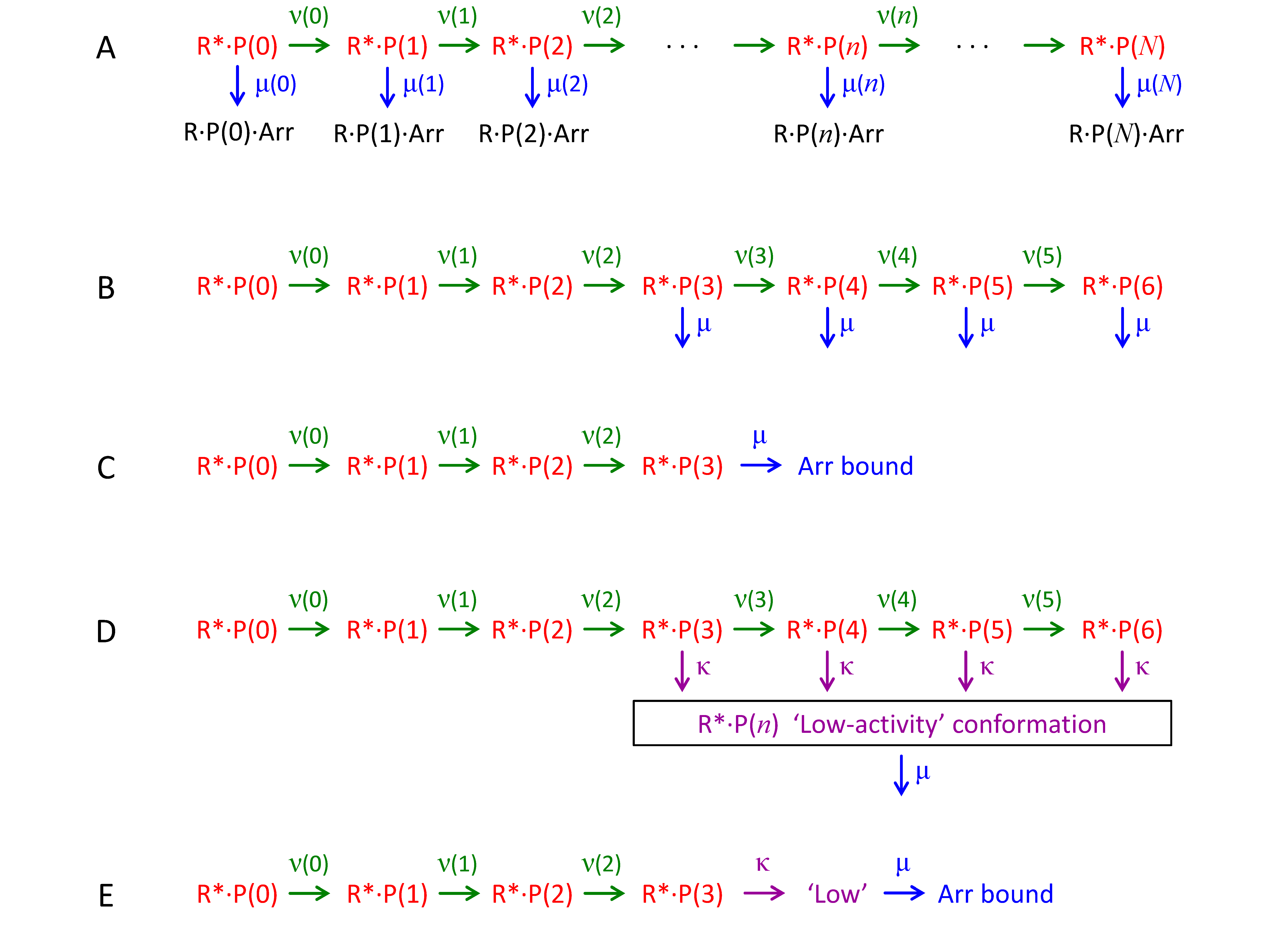 and the subsequent rate constant of arrestin binding is again μ. E: The truncated linear sequence to which the scheme in panel D is equivalent.