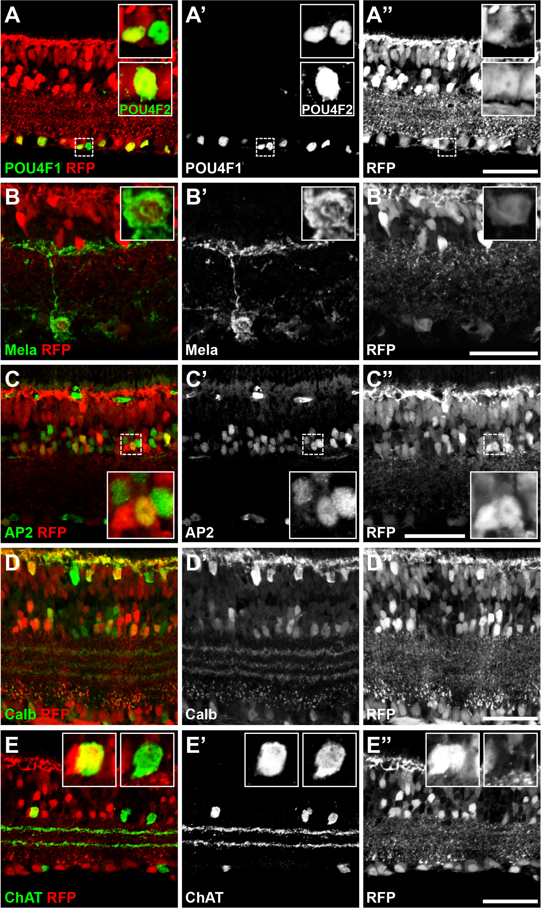 Pou4f2Cre/+ Ai9 mice by immunostaining retinal cryosections with a panel of markers. Channels are split out for better visualization.