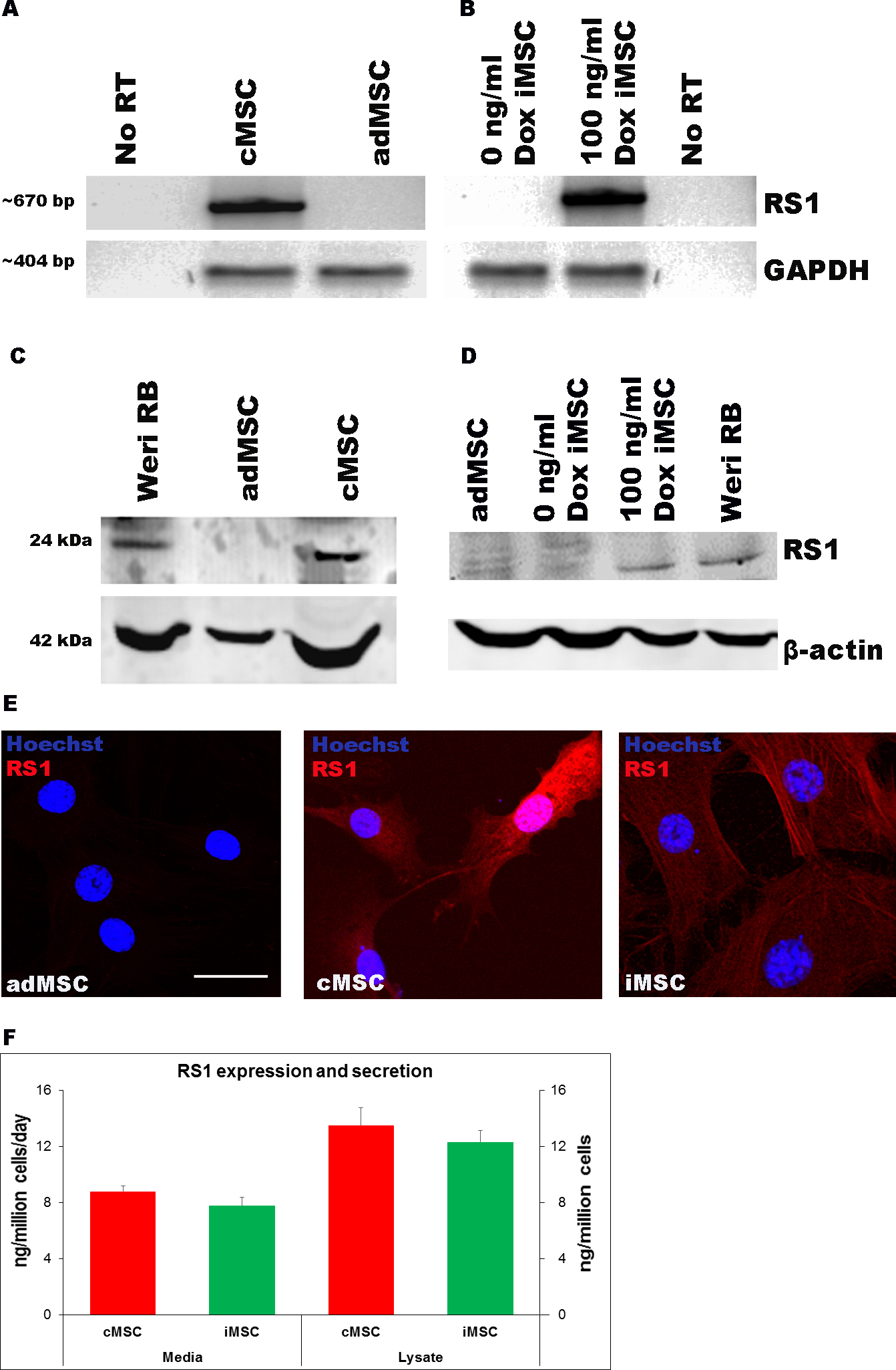 cells (adipose tissue MSCs, AMSCs). No RT, without reverse transcriptase. GAPDH (404 bp) used as loading control. B: RS1 mRNA expression in MSCs with the inducible vector (inducible MSCs). DOX = doxycycline. C: RS1 protein expression (24 kDa) in constitutive MSCs, untransfected AMSCs, and positive control Weri retinoblastoma (RB)