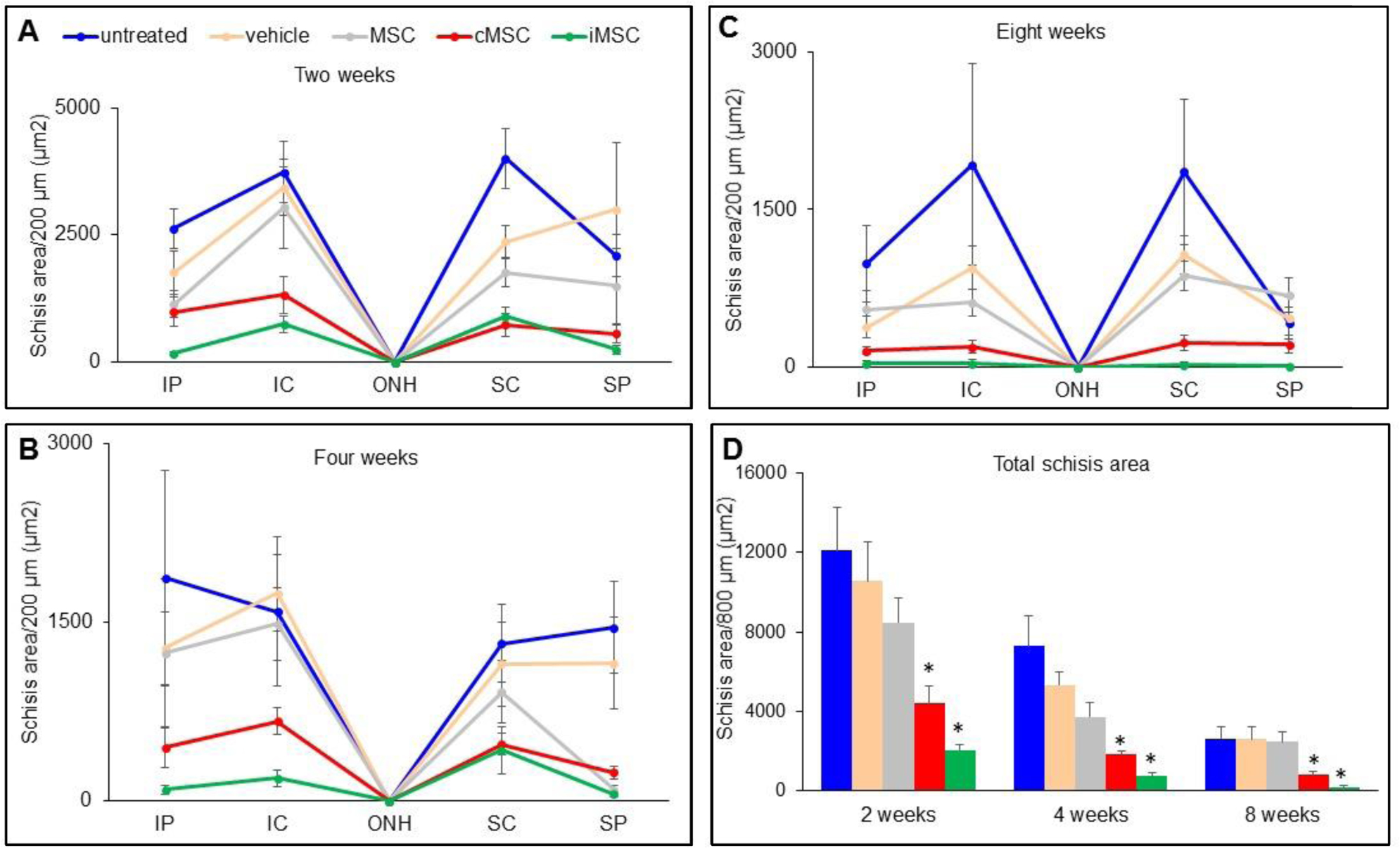 MSCs). D: The total schisis area from all four quadrants was calculated and compared among the groups at all three time points. Data