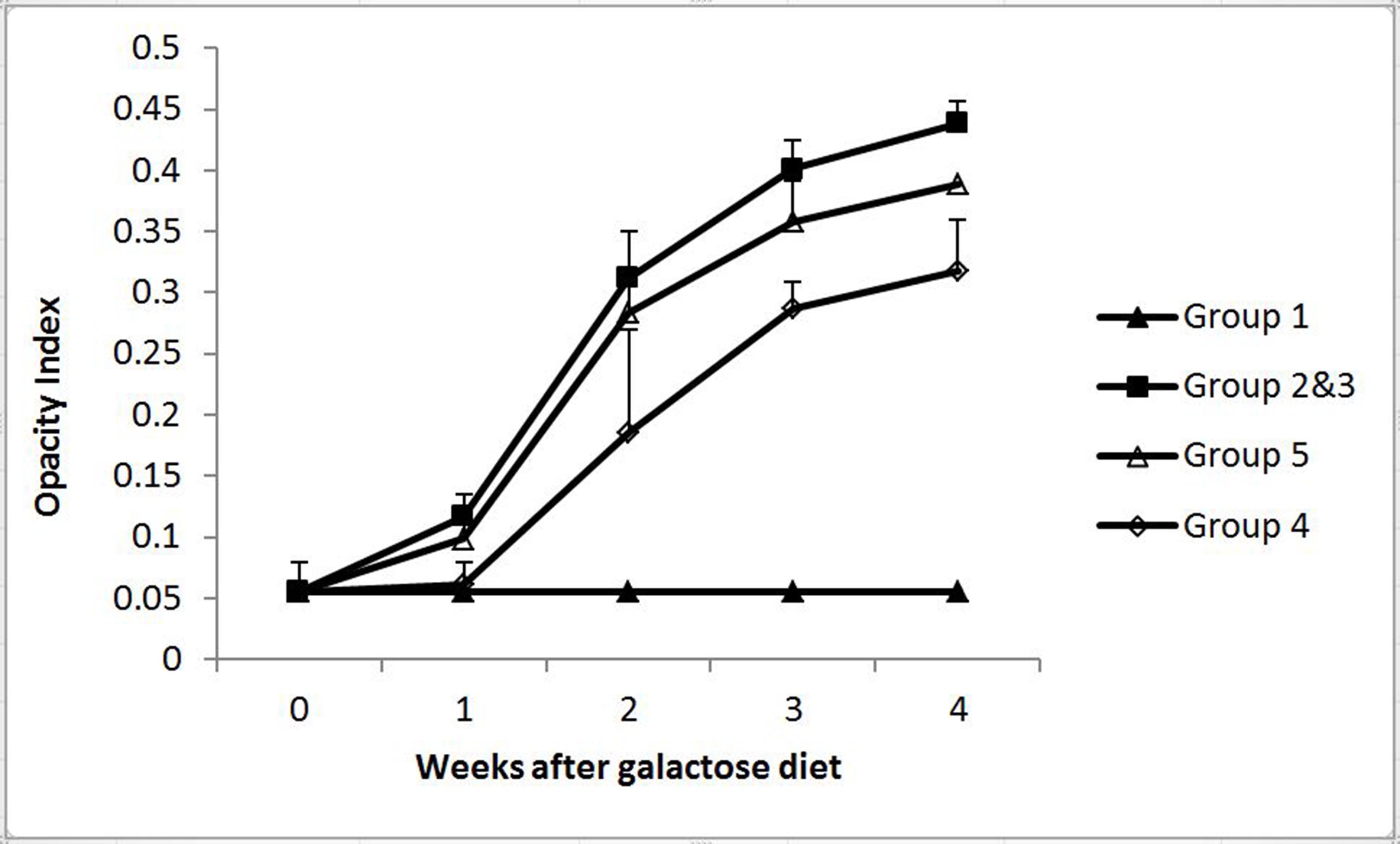 Figure 2. Effect of aqueous and liposomal MgT on the onset and progression of cataract in galactose-fed rats. Group 1, normal rats;
