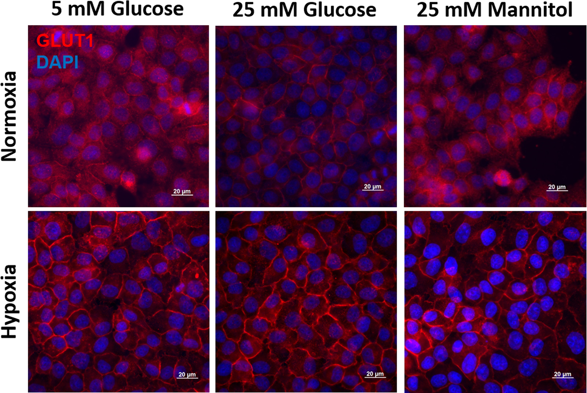 to hypoxia and normoxia. Staining for GLUT1 (red) shows higher intensity in the cell membrane of cells subjected to hypoxia.