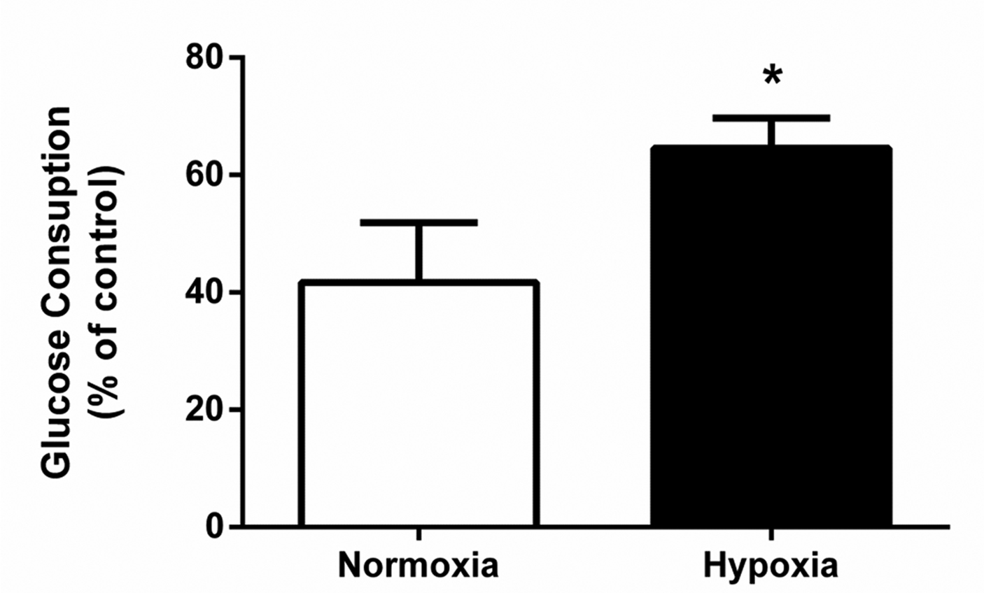 a significant difference in glucose consumption by cells in hypoxia compared with cells in normoxia, determined with the two-tailed