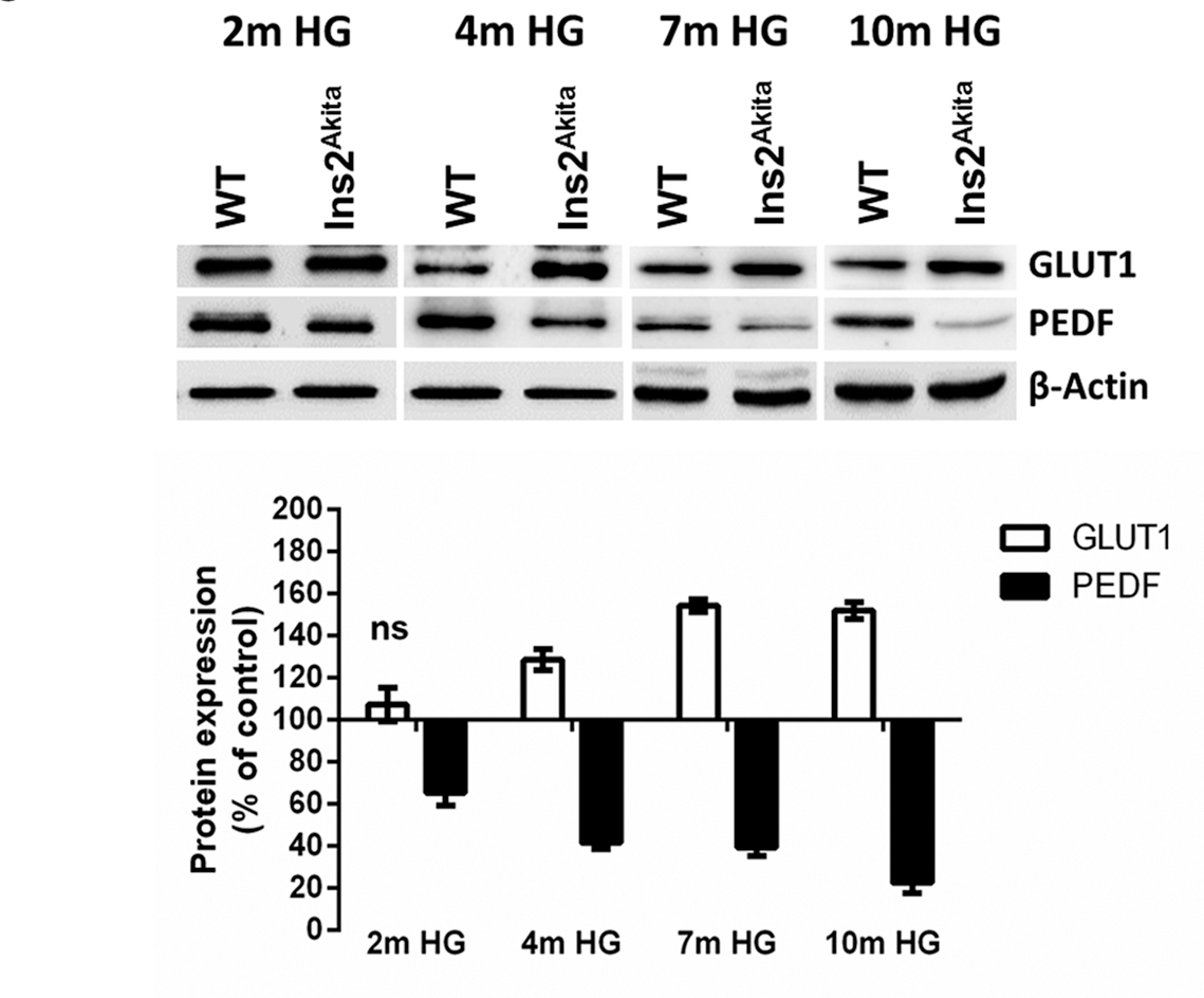 Quantitative data were obtained by normalization of β-actin bands and represents GLUT1 and PEDF expression in Ins2Akita related to WT (control). n = 6. ns represents non-significant data determined with Sidak’s multiple comparisons test, p<0.05.
