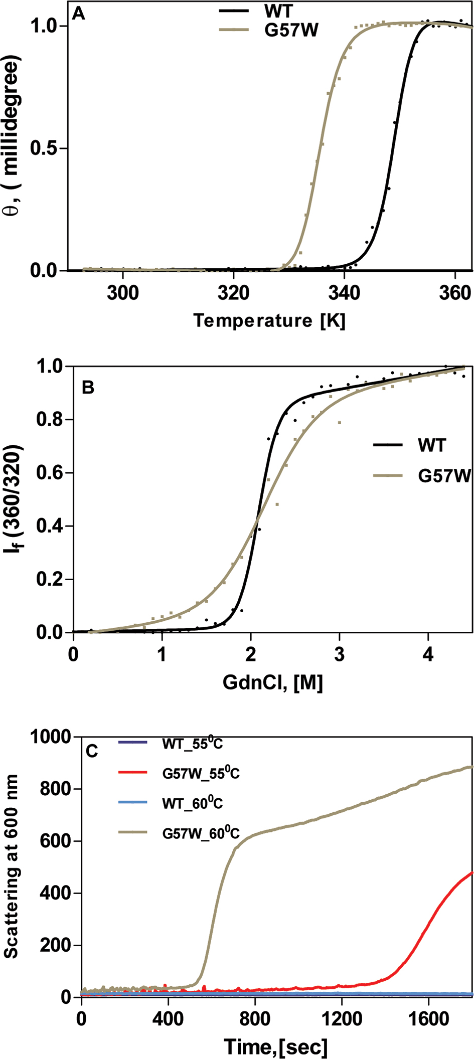 were recorded at 27 °C. The spectrum shown is the average of three runs. C: Thermal aggregation of WT and G57W CrygS at two different temperatures. Light scattering was measured at 600 nm for 1800