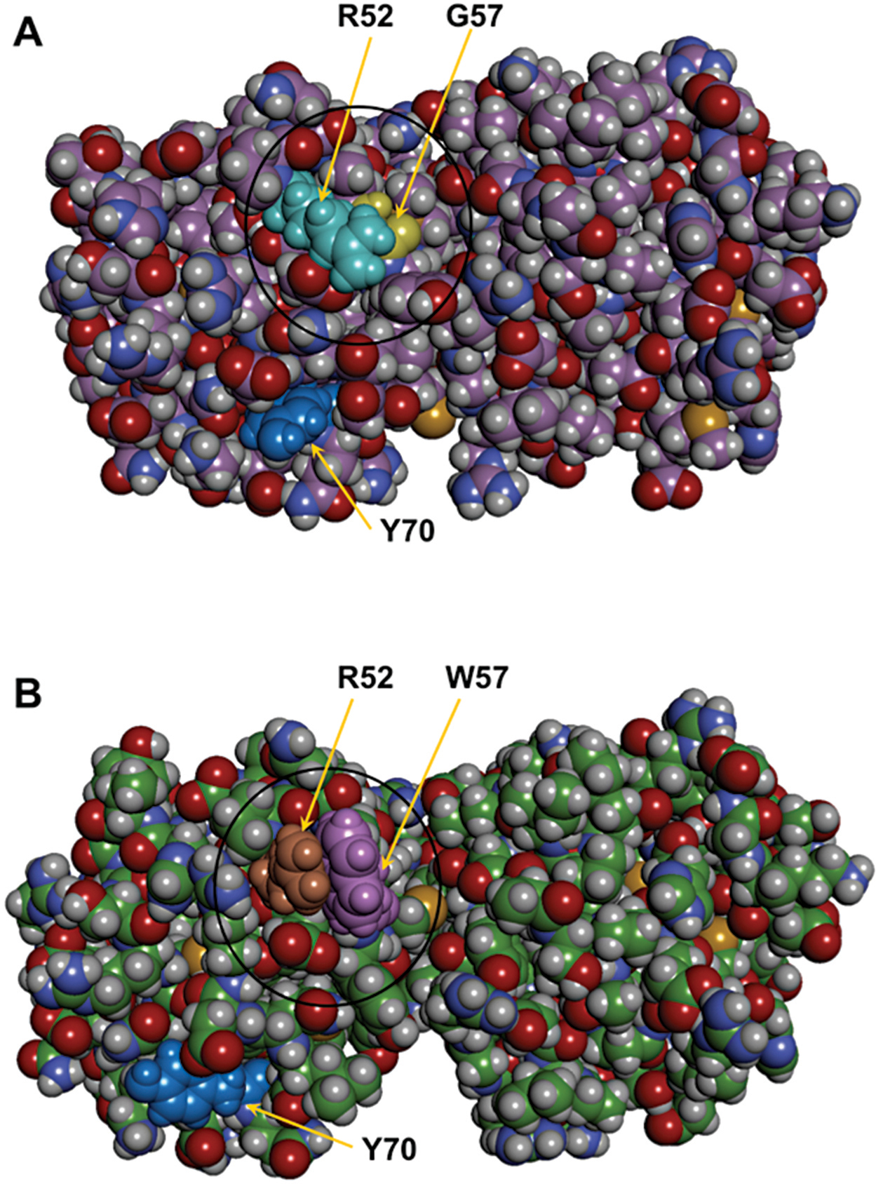 : Similar space-filling model of the mutant G57W.