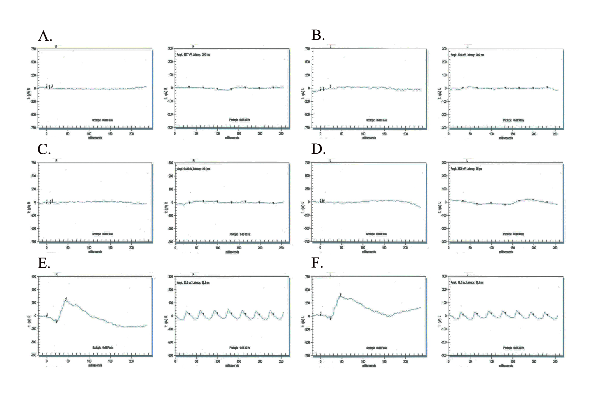 Responses are of A) OD and B) OS of individual 10 (affected: 30 years); C) OD and D) OS of individual 14 (affected: 25 years); and E) OD and F) OS of individual 8 (unaffected: 52 years). The affected individuals exhibit undetectable electroretinography responses whereas