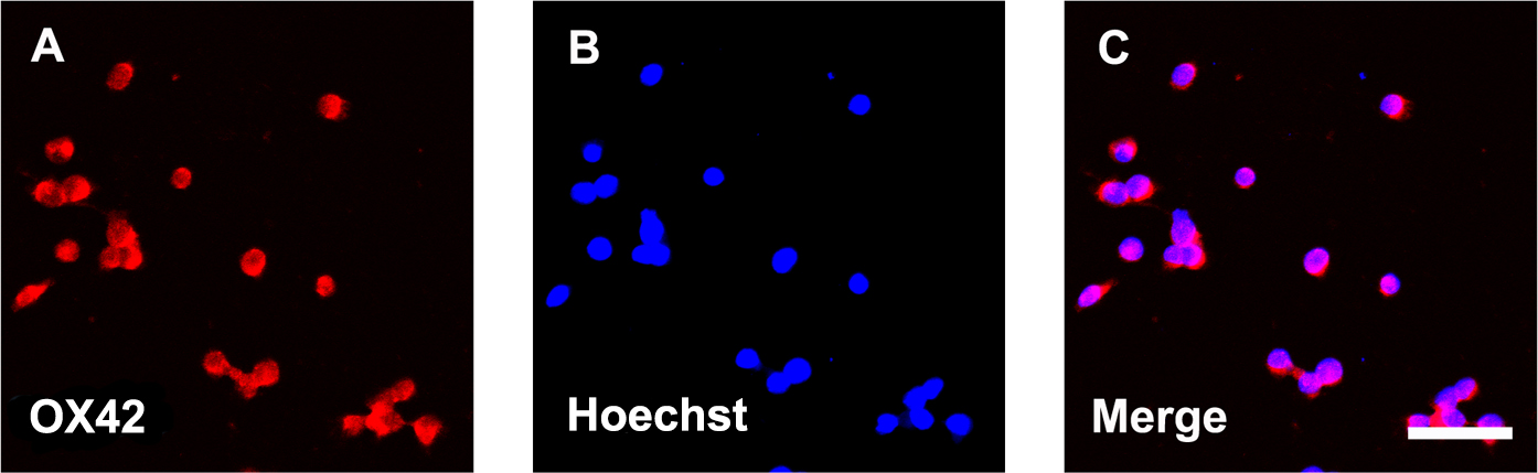 Figure 1. Primary RMG cells were identified with immunofluorescence staining of OX42. A: OX42 (red). B: Nuclear Hoechst staining (blue). C: The purple color visualized in the merged images represents the colocalization of OX42 with nuclear Hoechst staining. Scale