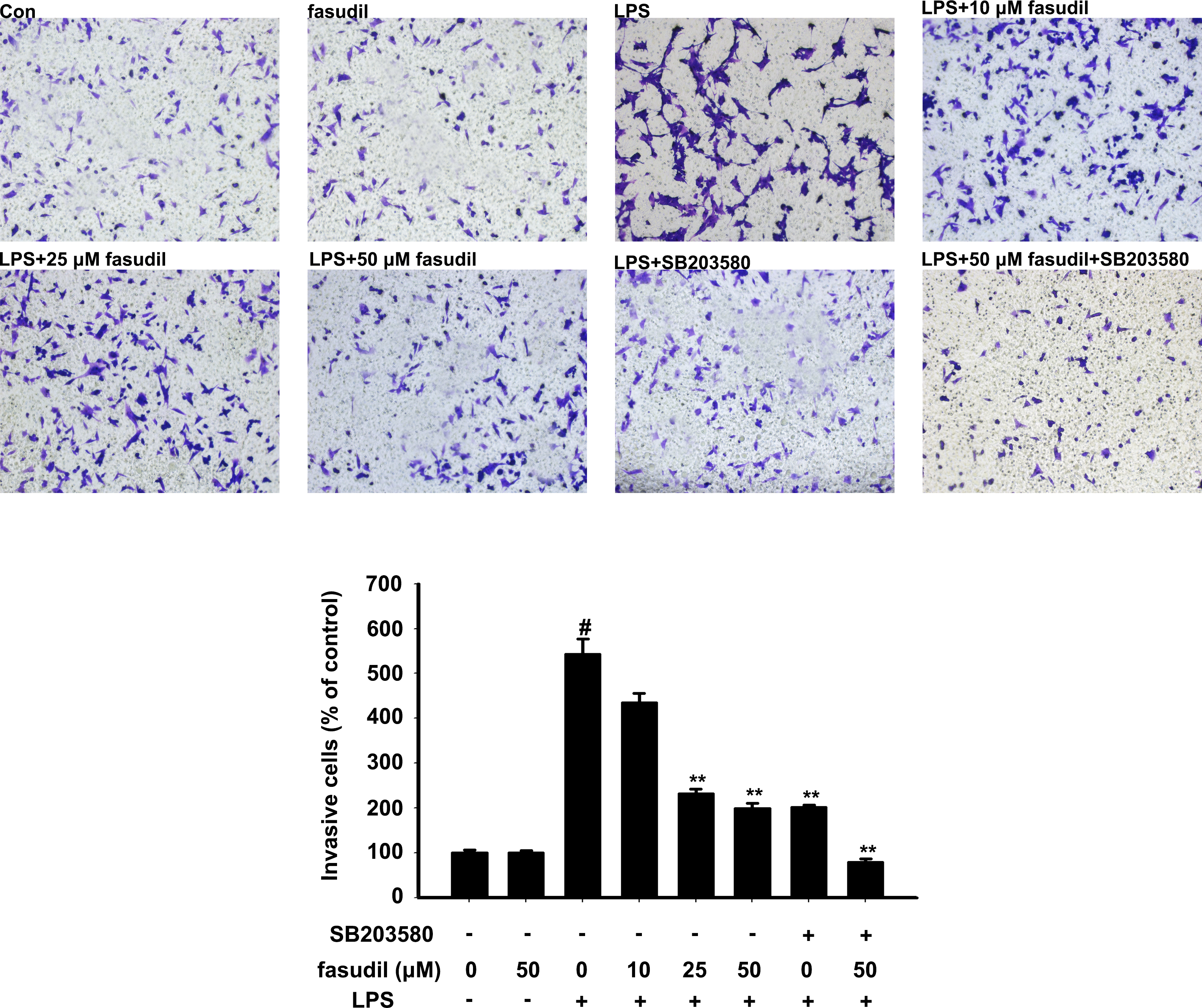 (LPS; 1 μg/ml), fasudil (10, 25, or 50 μM) + LPS (1 μg/ml), or fasudil (50 μM) + SB203580 (20 mM) + LPS (1 μg/ml) for 12 h.