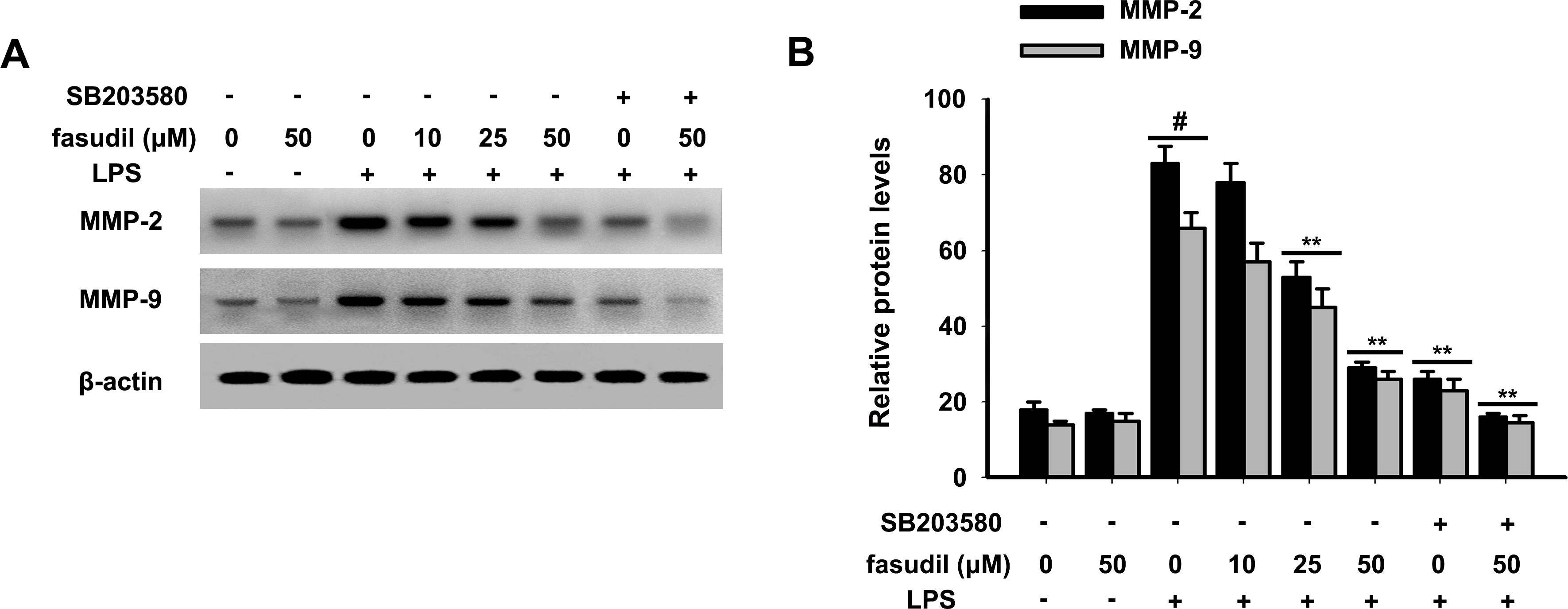 or absence of fasudil (50 μM) for 6 h in LPS-stimulated RMG cells. B: The relative protein band intensities were quantified with densitometric analyses and normalized to β-actin, MMP-2, and