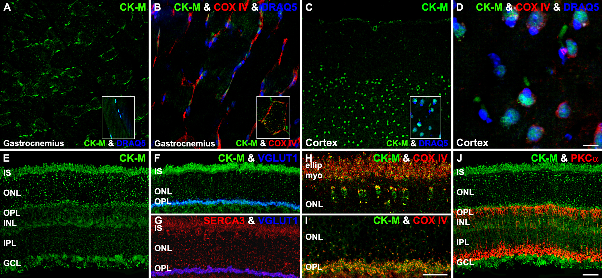cells labeled for CK-M and stained with DRAQ5. D: A higher magnification image of frontal cortex triple-labeled for CK-M, COX IV, and DRAQ5. E: Retina immunolabeled for CK-M. F: Outer retina double-labeled for CK-M and VGLUT1. G: Outer retina double-labeled for SERCA3 and VGLUT1. H and I: High-magnification images of the outer retina double-labeled for CK-M and COX IV. J: Retina double-labeled for CK-M and PKCα. COX IV = cytochrome c oxidase subunit IV, GCL = ganglion cell layer, INL = inner