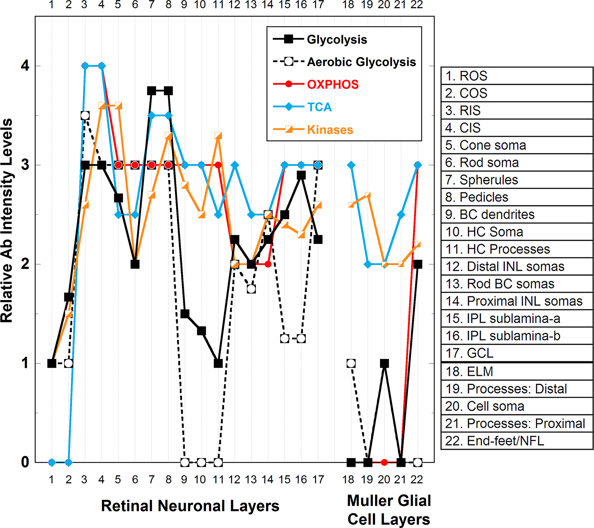 Figure 8). The BC dendrites, HC somas, and HC process have no apparent aerobic glycolytic capacity. Except amacrine cells in the proximal