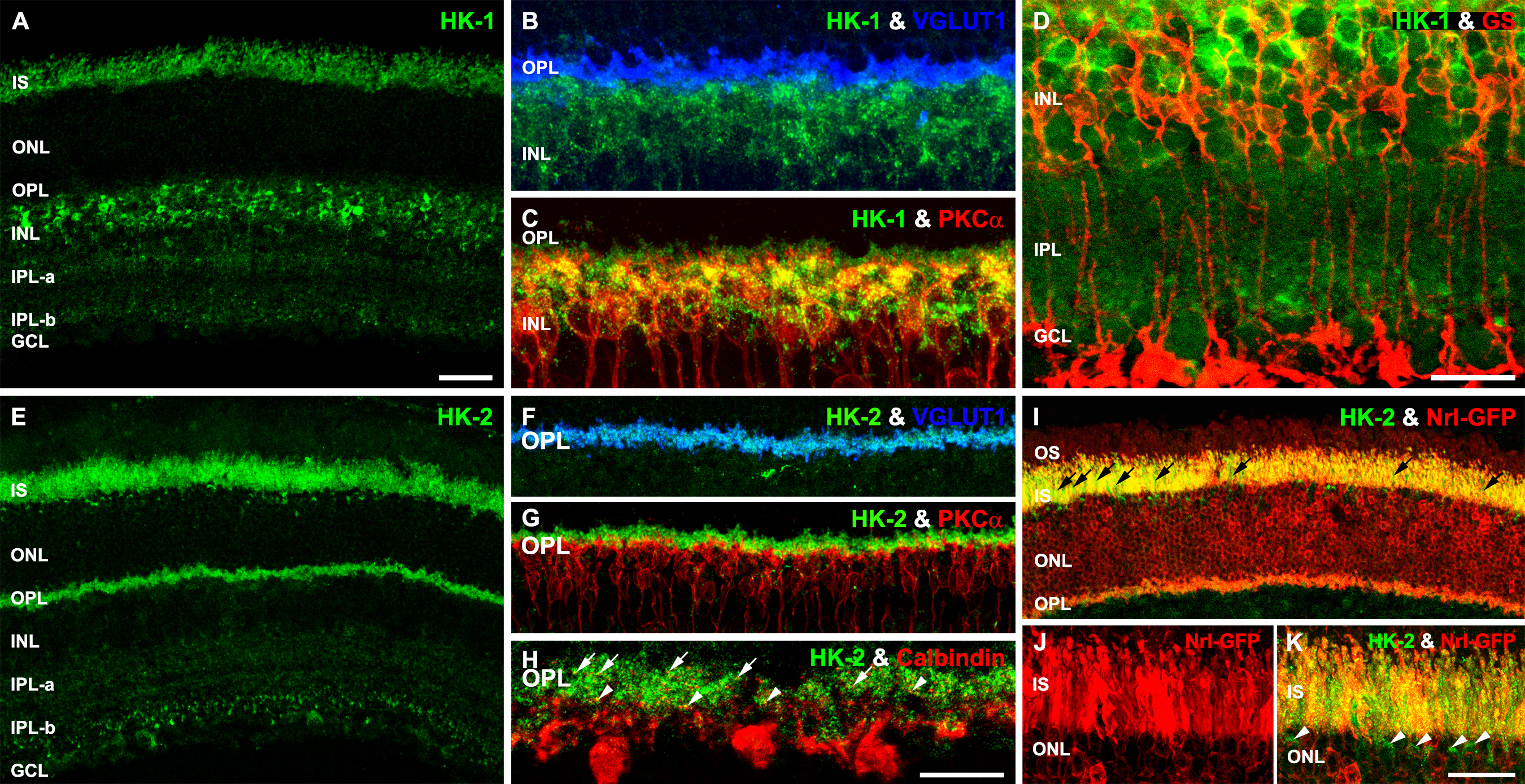 pixels) and HK-2 expression in the cone OSs and ISs (green pixels: black arrows) and pedicles (green pixels). J: High-magnification image of the OS-IS from Nrl-GFP transgenic mice (pseudocolored in red). K: High-magnification image of Nrl-GFP retina colabeled for HK-2 shows colocalization in the rod ISs and spherules (yellow-orange pixels) and localization of