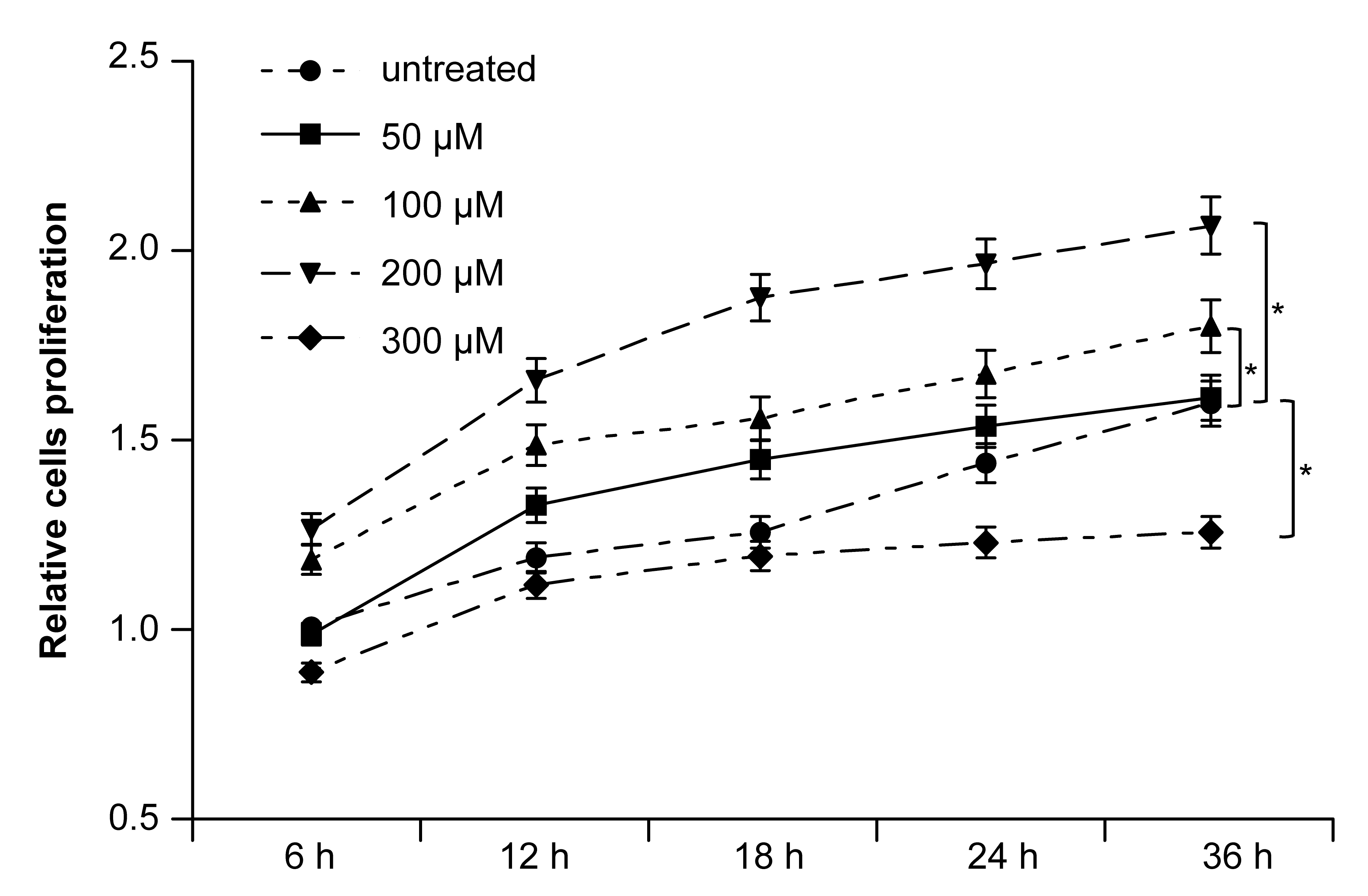 Analysis of effect of chemical hypoxia on the proliferation of ARPE-19 cells with MTT assay. The cell proliferation from three independent experiments is expressed as mean ± standard deviation (SD), n = 3.