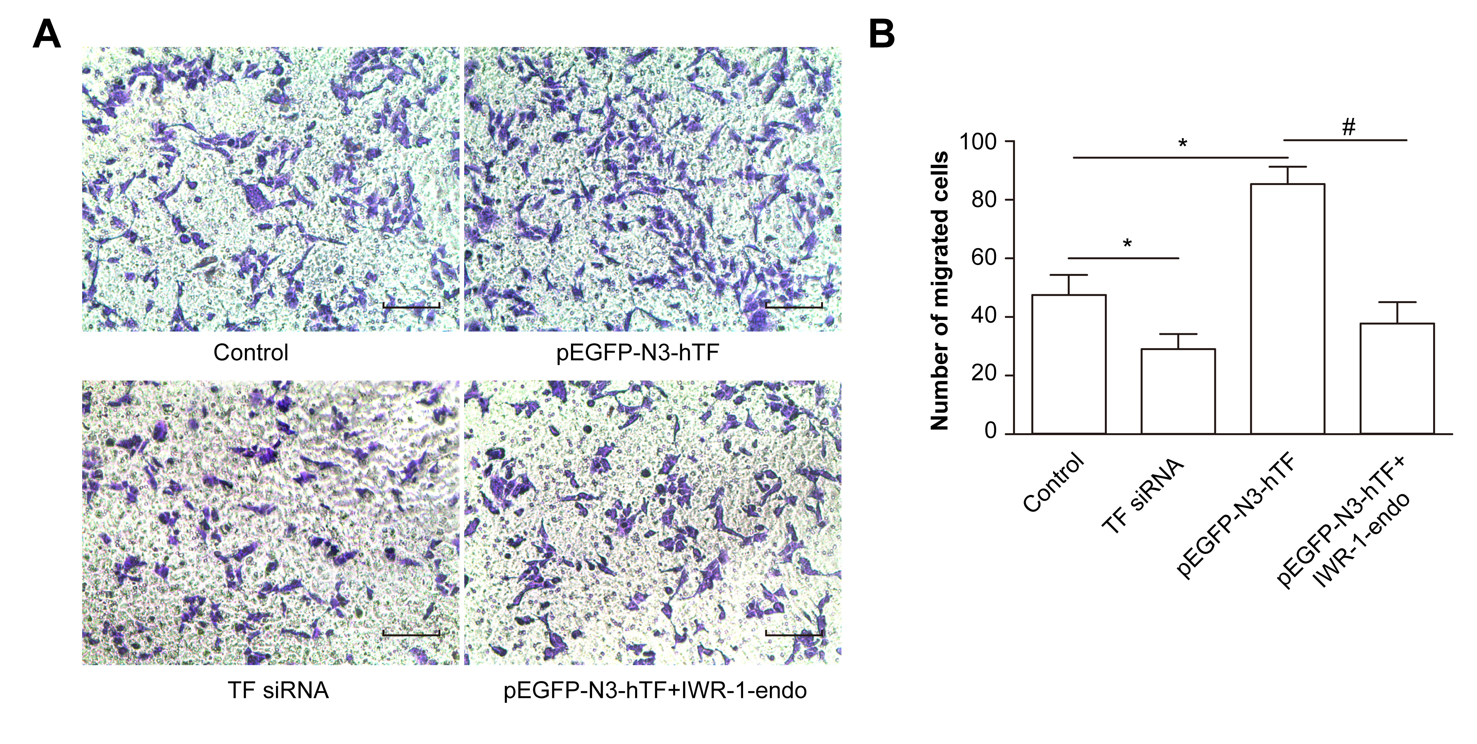 reduced with the Wnt inhibitor (#p<0.01, pEGFP-N3-hTF versus pEGFP-N3-hTF+IWR-1-endo). Bar = 50 μm.