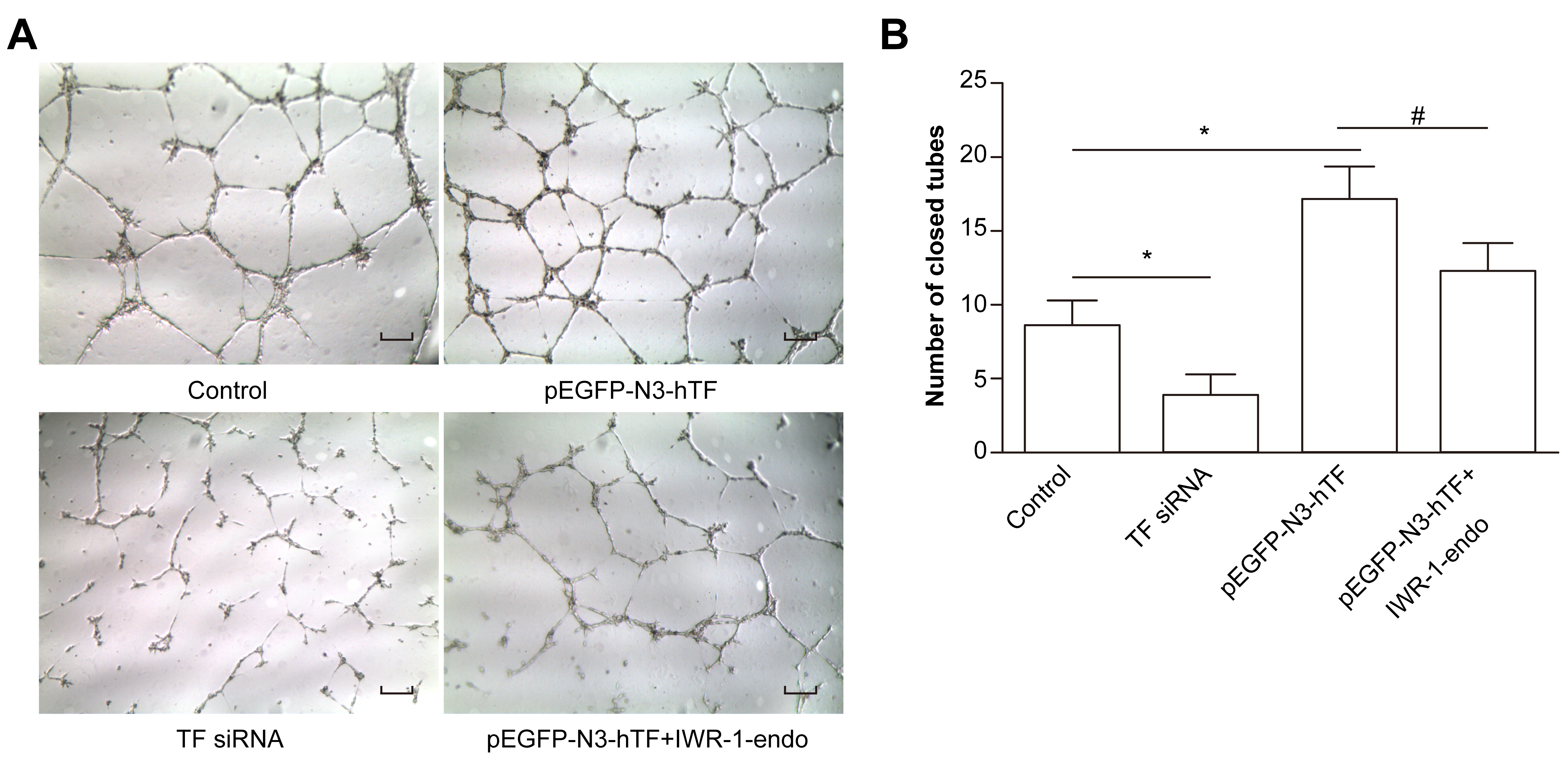 (#p<0.01, pEGFP-N3-hTF versus pEGFP-N3-hTF+IWR-1-endo). Bar = 100 μm.