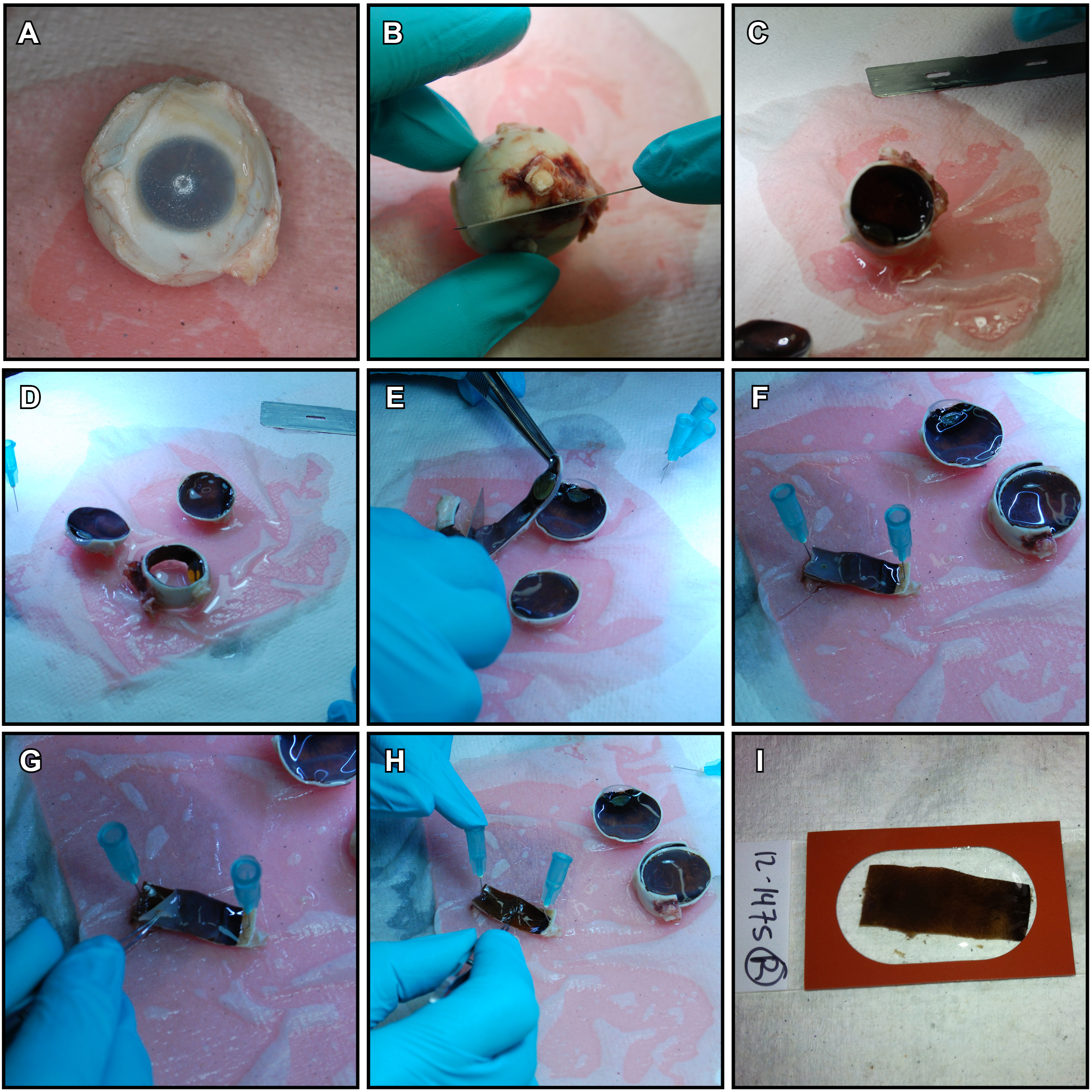 macula and then making the second cut at the optic nerve border. F: The cut tissue section was pinned to a paper-covered wax board and trimmed to an appropriate size if necessary. G: Using forceps, the retina layer was peeled away from the RPE. H: Using closed curved forceps, the RPE/choroidal tissue was separated from the underlying sclera. Microscissors may be required