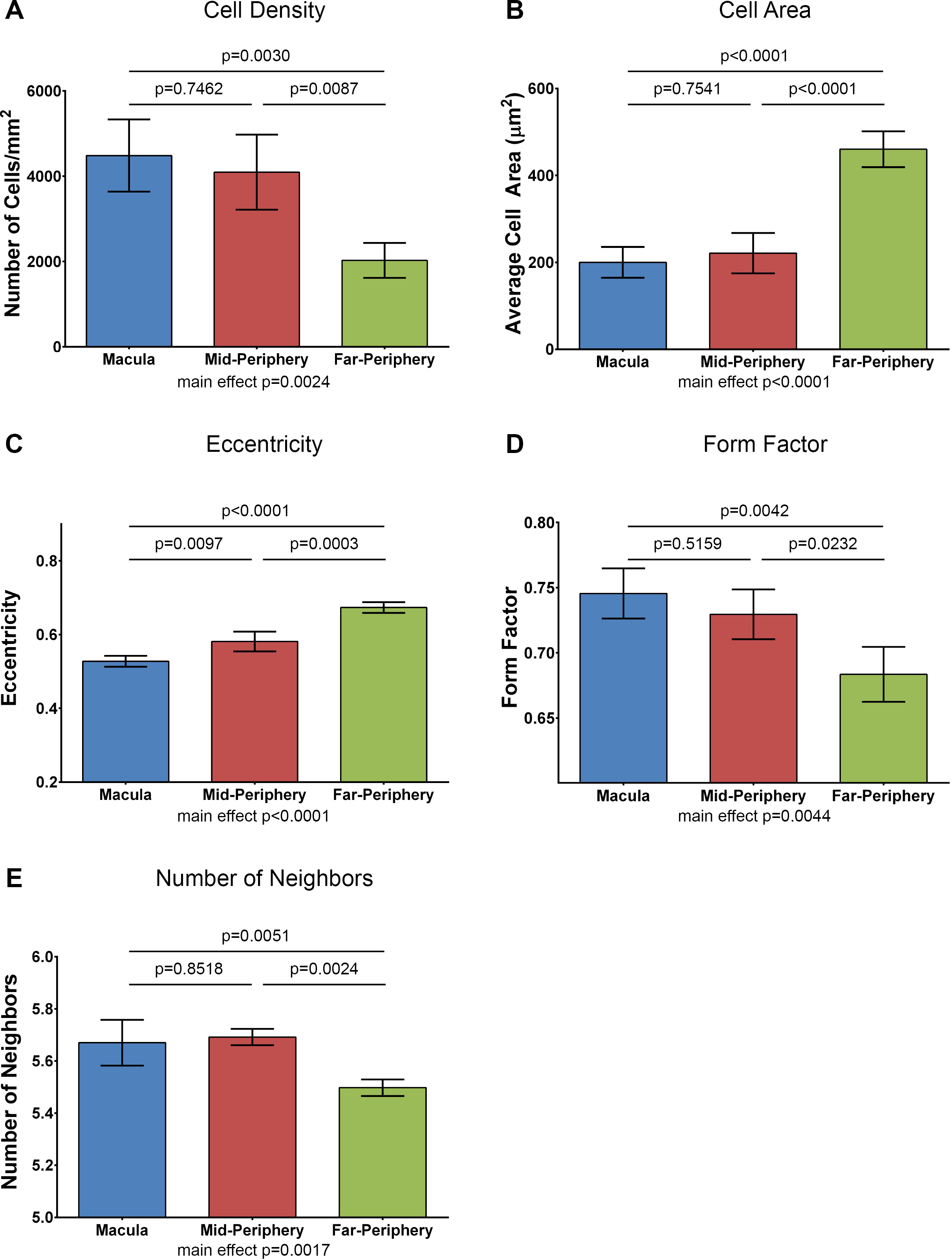 Figure 7. Analysis of spatial variation of RPE morphometry. A: Average cell density. B: Average cell area. C: Average eccentricity. D: Average form factor. E: Average percentage of hexagonal cells. These were averaged across all age groups in three areas of the retina. Error bars