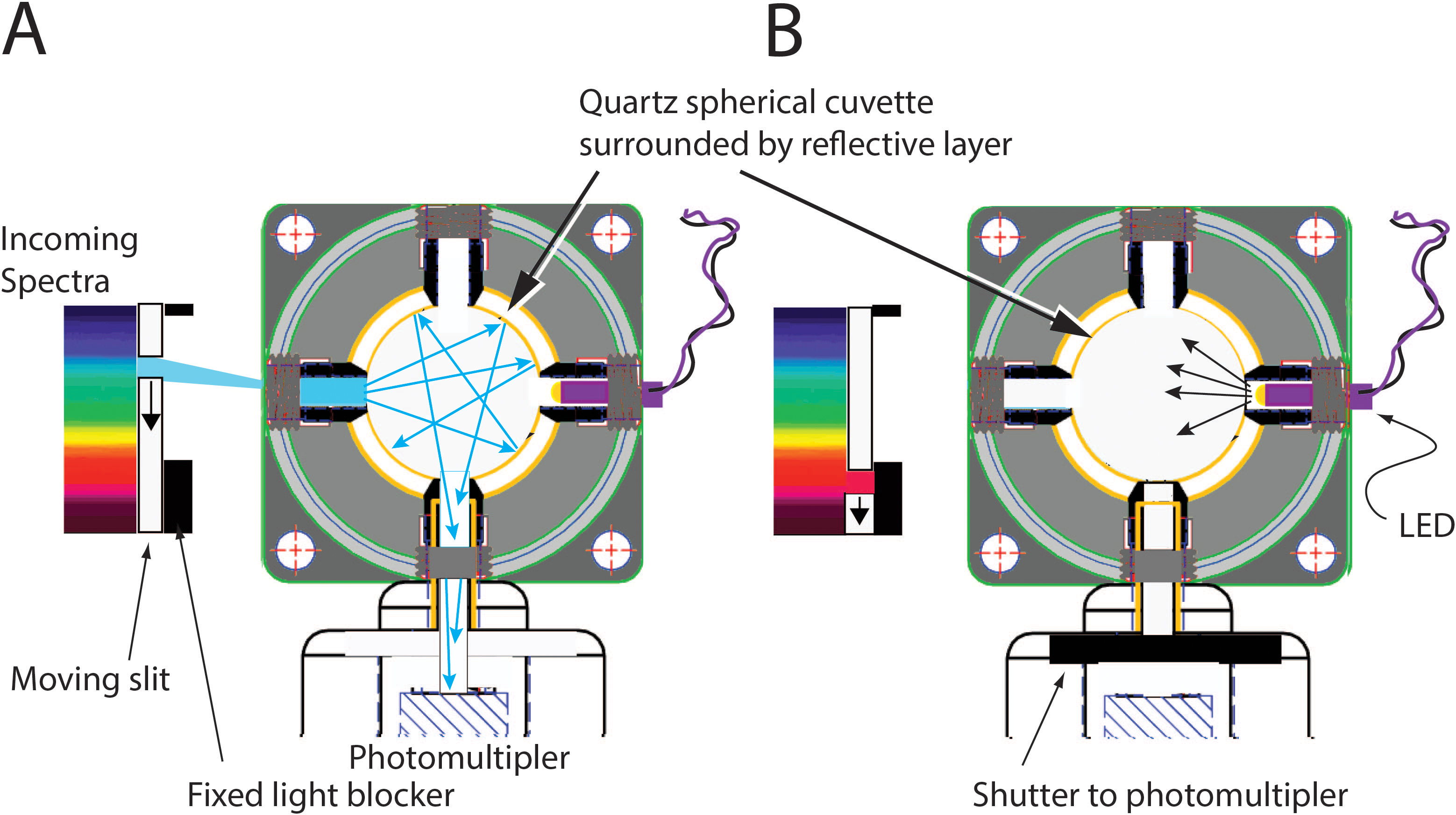 Figure 1. RSM with integrating cavity absorption meter and actinic LED source. A: Scan phase: The moving slit from the rapid-scanning spectrophotometer (RSM) creates spectral scans at a rate of 100 scans