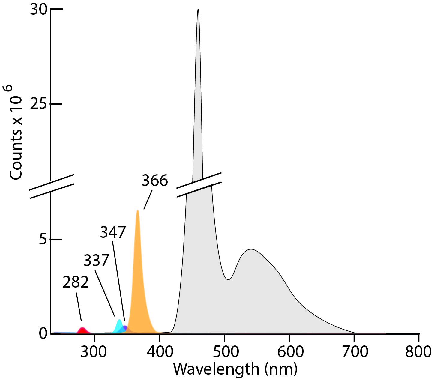 Spectral output of the actinic light-emitting diodes (LEDs). LEDs can be placed individually within the DeSa Suspension Presentation Cavity (DSPC) port as shown in