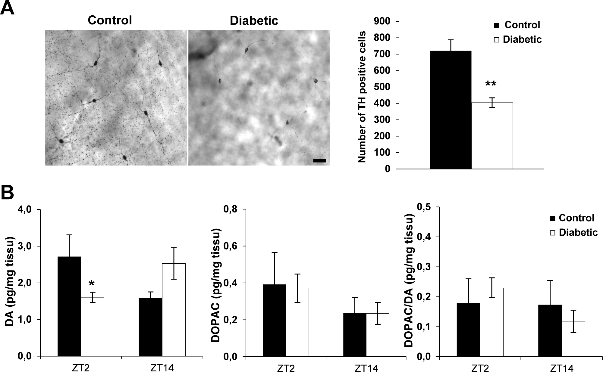 control and diabetic groups, whereas no significant difference was observed at ZT14. The DOPAC content and the DOPAC/DA ratio