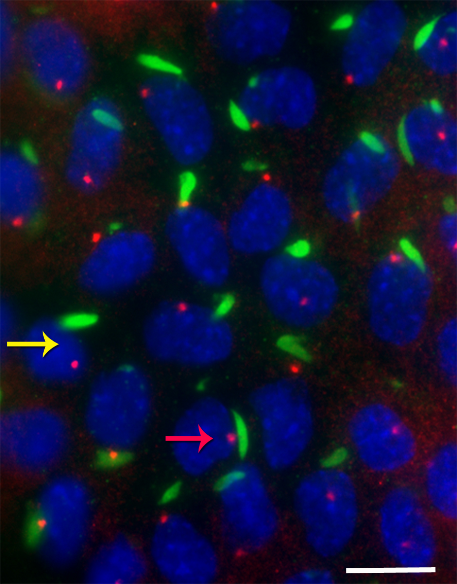 epithelial explant. Yellow arrow marks a cell where the two signals are clearly unrelated, while the red arrow marks a cell